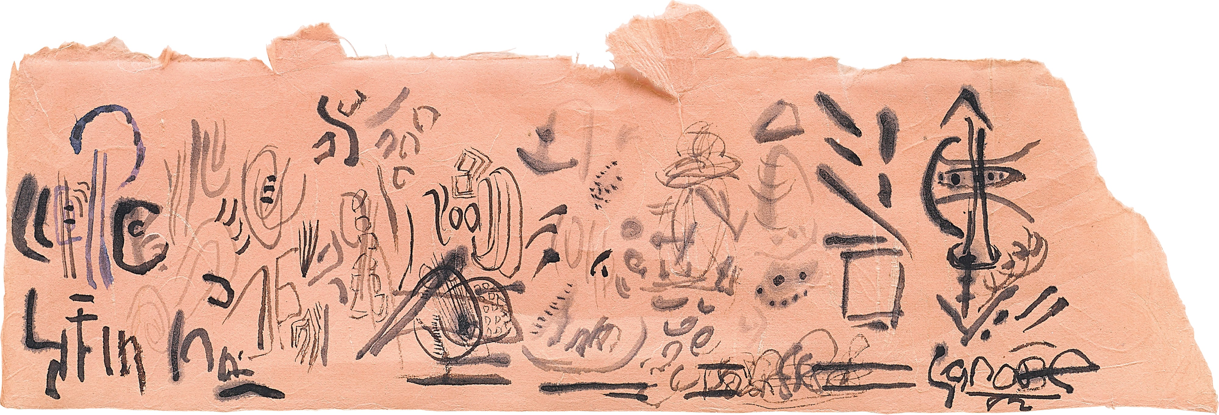 A dynamic exploration of gestural abstraction, this ink and wash work on rice paper captures Pollock's signature spontaneous energy through sweeping, interlocking lines that dance across the delicate surface. The absorbent quality of the rice paper allows the ink to bleed and feather, creating organic variations in tone and texture that echo the traditions of East Asian calligraphy while remaining distinctly rooted in Pollock's Abstract Expressionist vision. The interplay between bold, fluid strokes and softer washes suggests both controlled intention and uninhibited freedom.