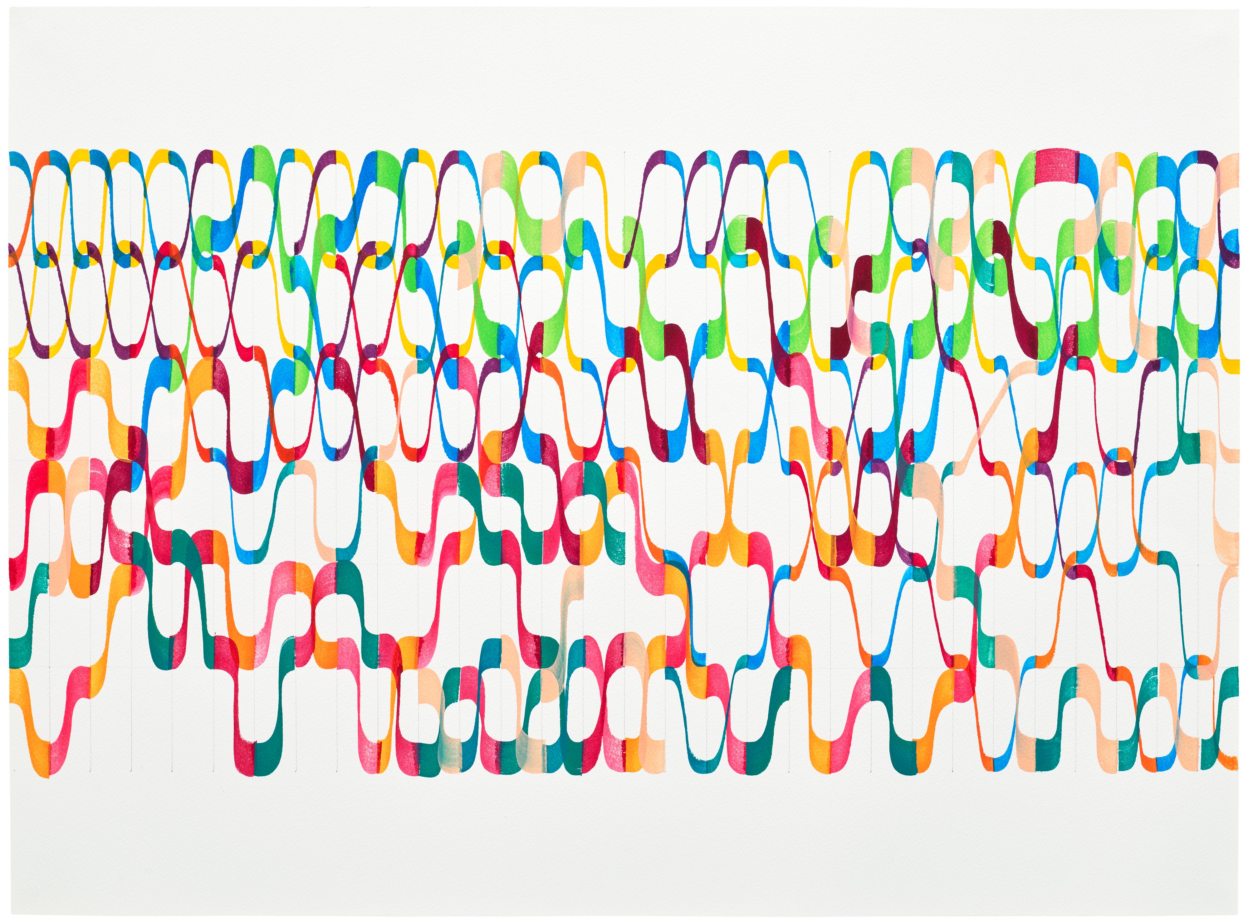A delicate yet precise composition rendered in watercolour, this work balances geometric clarity with the fluid, unpredictable nature of the medium. Poncelet explores the tension between structure and spontaneity, allowing washes of colour to both define and dissolve form. The result is a quietly meditative piece that reflects her long-standing investigation into pattern, material, and visual rhythm.