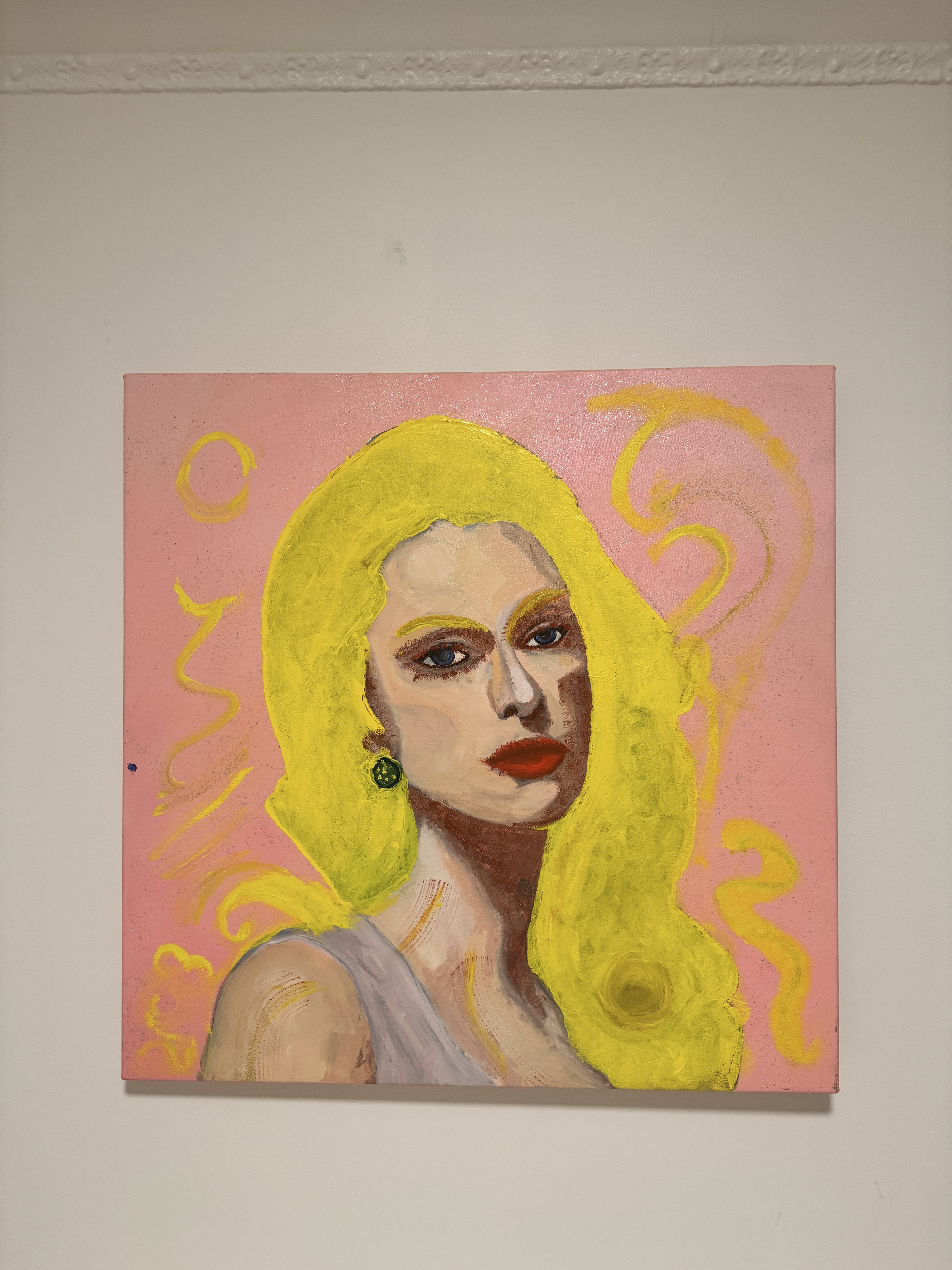 A boldly executed acrylic portrait depicting Paris Hilton with striking neon-yellow hair set against a soft pink background adorned with swirling golden decorative motifs. The subject is rendered with expressive, gestural brushwork featuring red lips, green drop earrings, and a white sleeveless top, conveying a glamorous yet painterly Pop sensibility. Decorative spiral and wave forms fill the background, referencing both celebrity iconography and ornamental painting traditions. The square format and vivid palette give the work strong visual presence suitable for contemporary interiors.