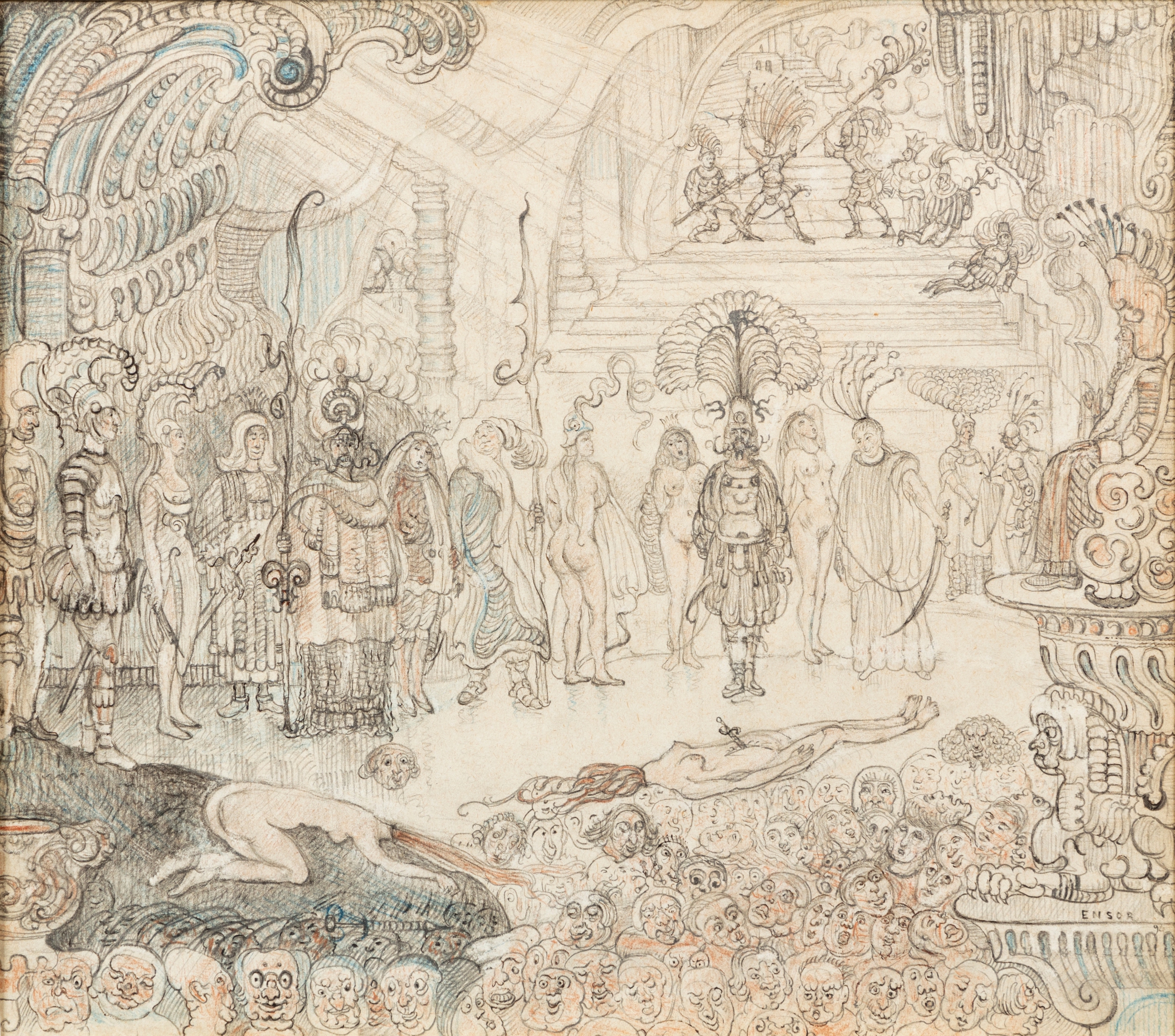 James Ensor's 'Petits supplices persans' is an 1896 work rendered in pencil, colored pencil, and ink on paper depicting scenes of Persian torture. The work showcases Ensor's macabre sensibility and his virtuosic draftsmanship in rendering disturbing imagery.