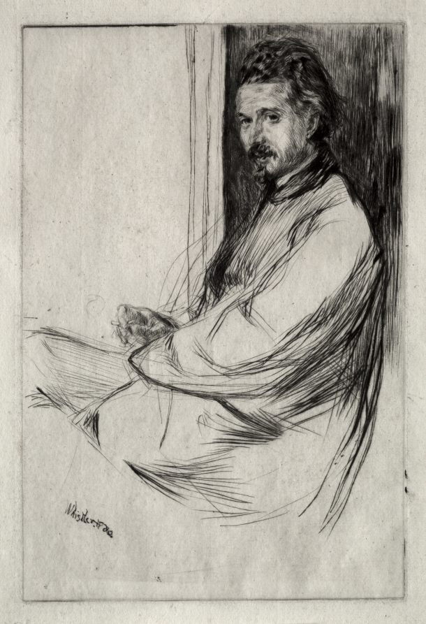 Among his earliest drypoint experiments, the portrait demonstrates Whistler's growing mastery of the medium's capacity for subtle tonal gradations and atmospheric effects.