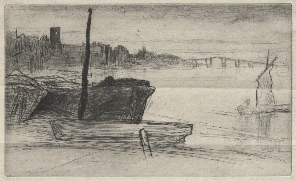Part of the Thames series, this etching captures the industrial London landscape with the artist's characteristic blend of precise observation and poetic interpretation.