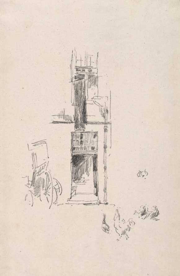 Domestic tranquility pervades this delightful lithograph of farmyard fowl, demonstrating how Whistler could find artistic poetry in the most humble subjects.
