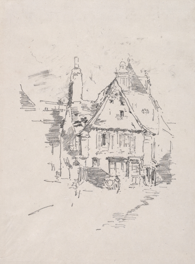 Medieval Breton architecture comes alive through Whistler's sophisticated lithographic technique, capturing the picturesque quality of this historic French town with remarkable tonal subtlety.