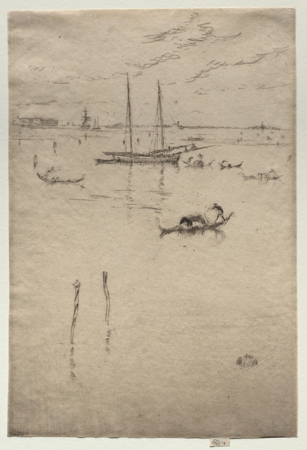 Venetian waterscape distilled to its essential elements showcases Whistler's economical use of line to suggest vast atmospheric spaces.