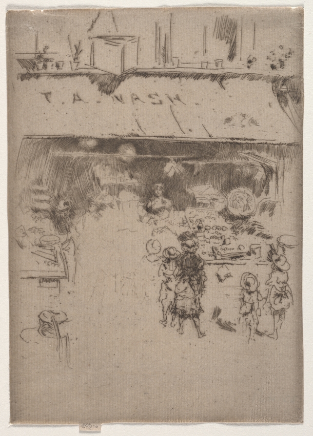 London street commerce becomes art in this etching that combines Whistler's sharp observational skills with his gift for finding beauty in everyday urban scenes.
