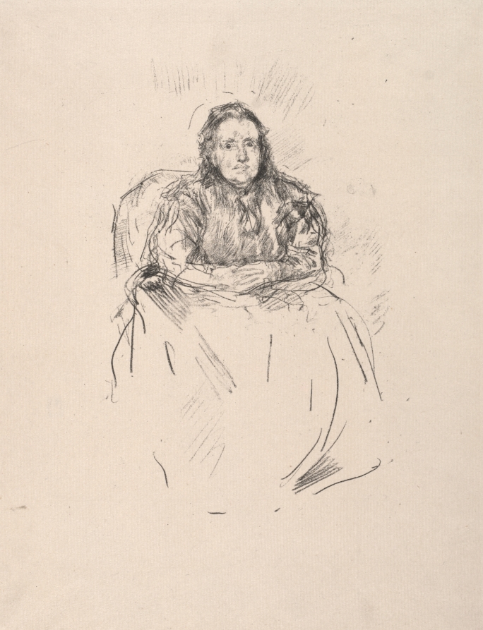 This lithograph by James McNeill Whistler demonstrates the artist's characteristic economical approach to portraiture, employing minimal linework to capture the essence of his subject with remarkable subtlety. Created during Whistler's prolific period of printmaking, the work exemplifies his mastery of the lithographic medium, where he skillfully used tonal variations and selective detail to create a sense of refined elegance. The portrait reflects Whistler's aesthetic philosophy of capturing personality through suggestion rather than exhaustive representation, a principle that earned him recognition as one of the finest portraitists of the late nineteenth century.