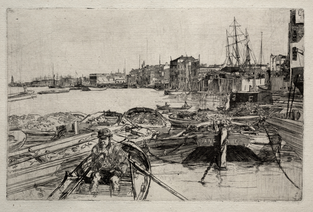 London's commercial waterfront provides the setting for this atmospheric study of maritime activity and urban energy. Strong compositional structure supports Whistler's characteristic interest in tonal harmony over descriptive detail.