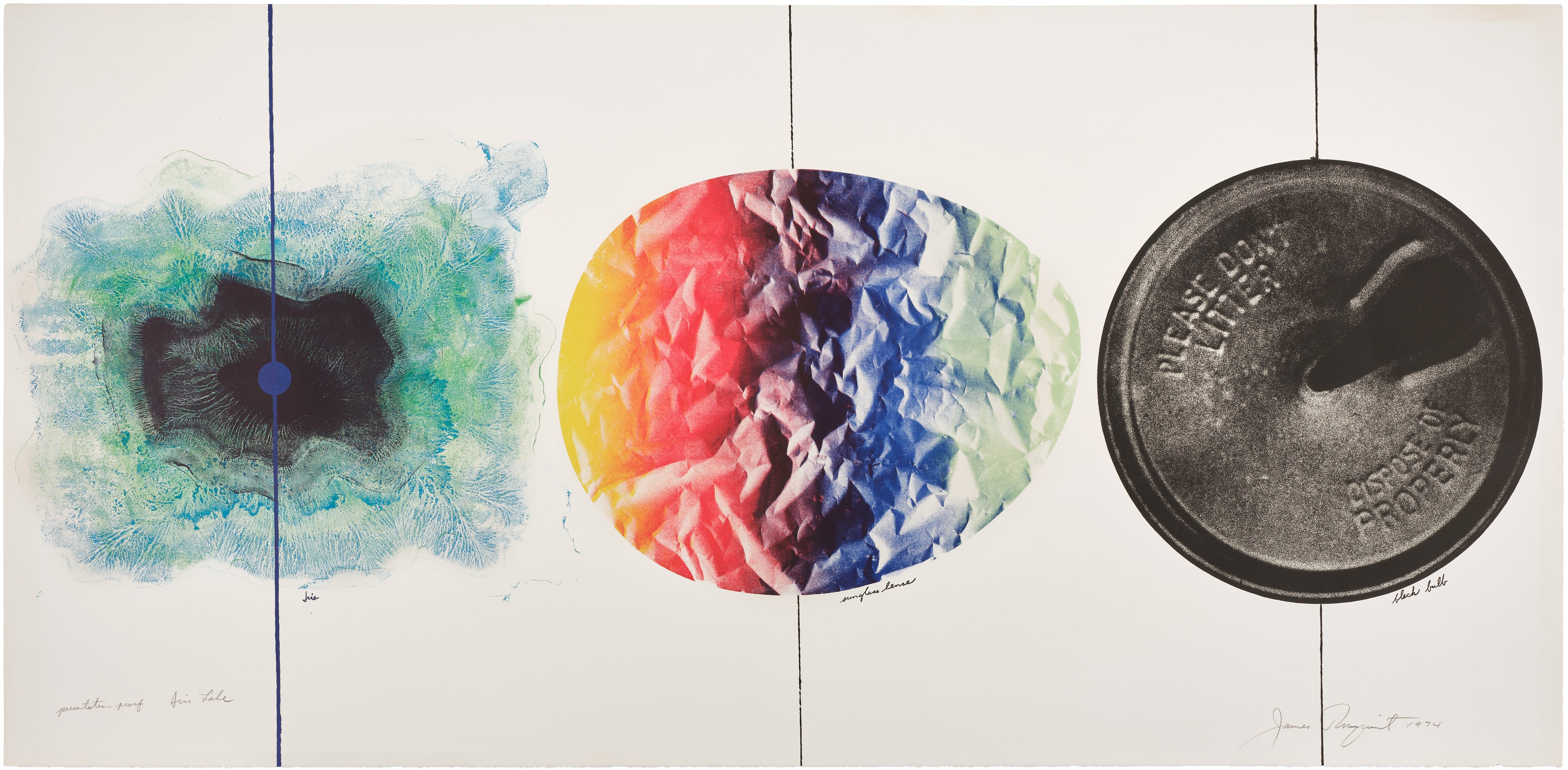 Iris Lake is a monumental lithograph by American Pop Art pioneer James Rosenquist, rendered in vibrant colors on Arches Cover paper. The work showcases Rosenquist's signature style of fragmented, large-scale imagery, weaving together bold forms and vivid hues that blur the boundaries between abstraction and representation. Printed on the full sheet, this impressive composition demonstrates the artist's masterful command of the lithographic medium and his ability to transform commercial visual language into striking fine art.
