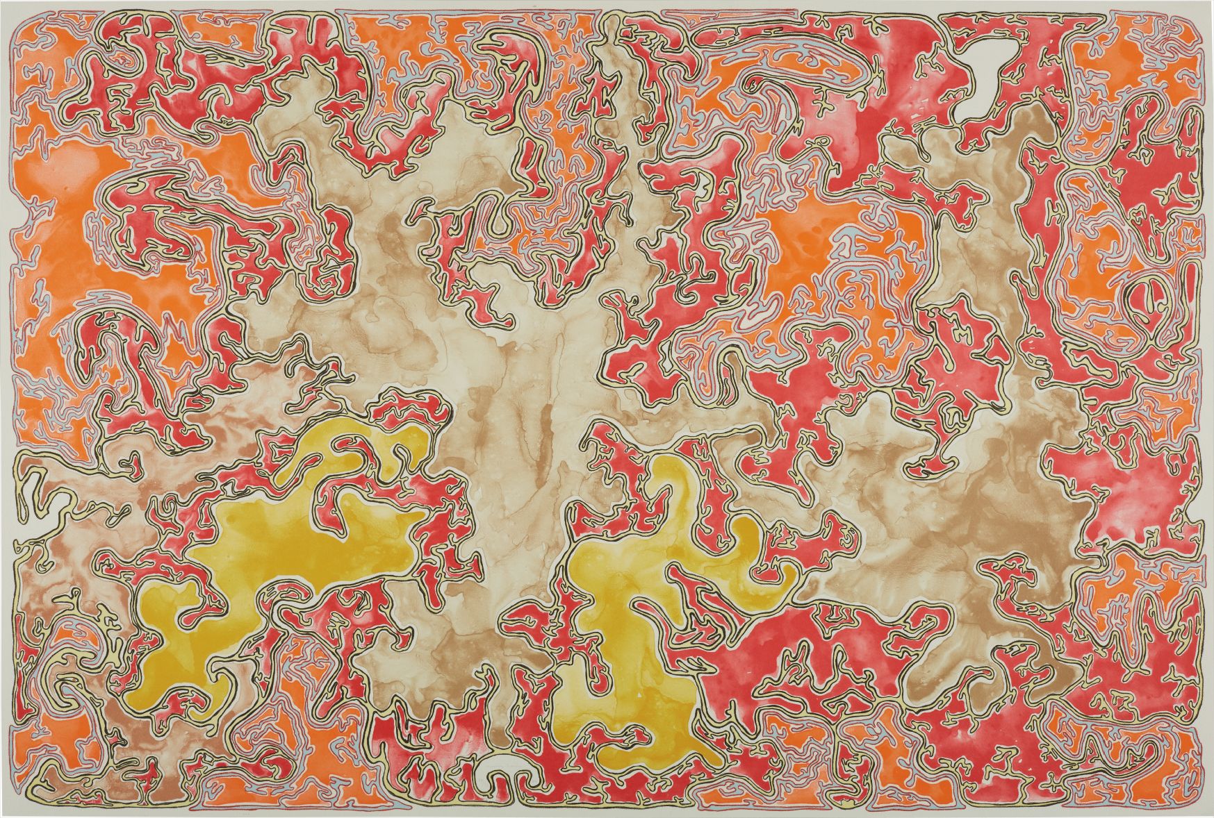 Tanagra is a vibrant lithograph in colors by James Siena, printed on Arches cover paper with full margins. The work exemplifies Siena's signature systematic approach to pattern and form, where intricate, rule-based structures create a mesmerizing visual rhythm across the composition. The richness of the color lithography process enhances the precise, interlocking geometries that have become central to Siena's artistic practice.