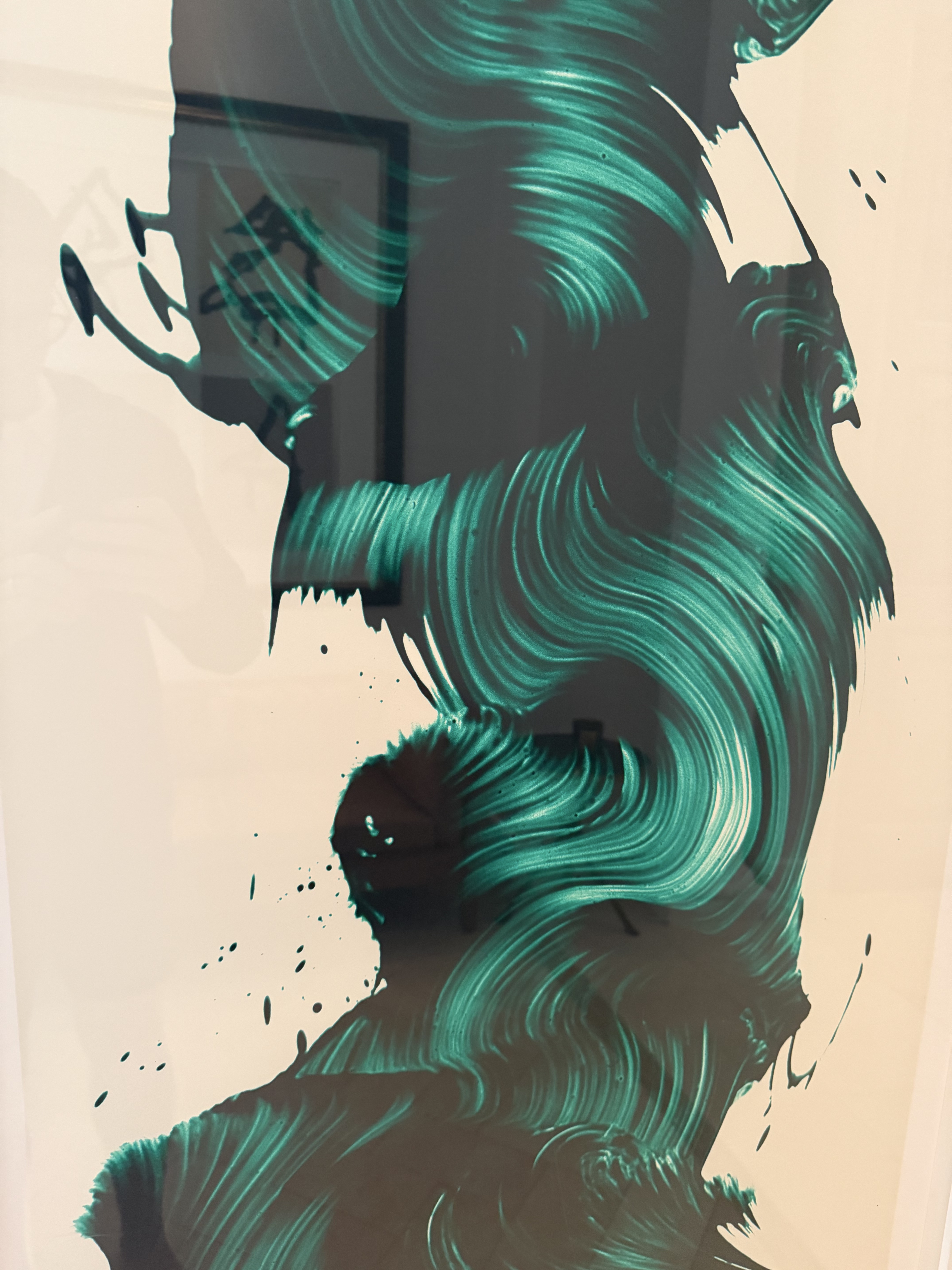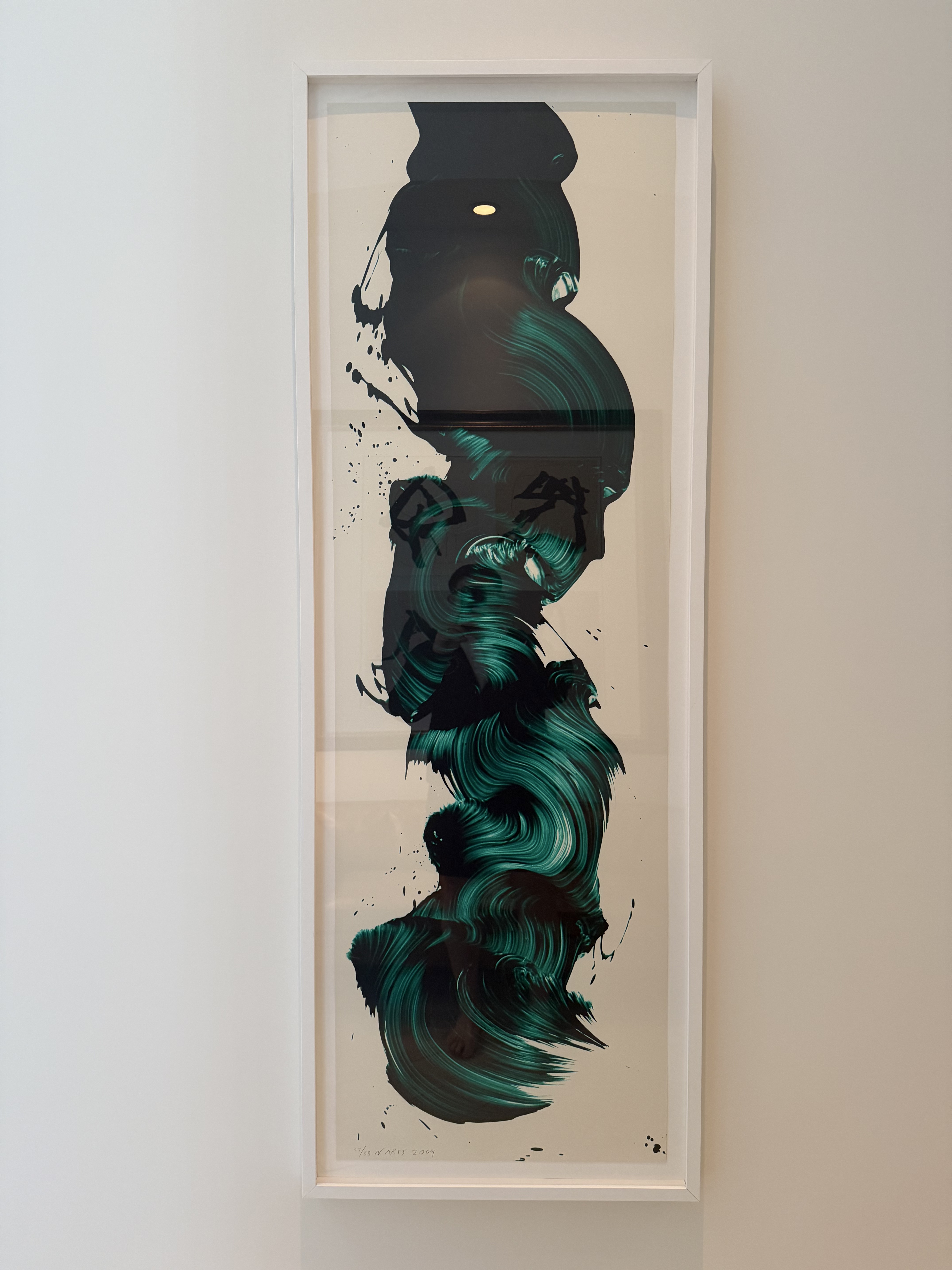 A commanding vertical screenprint by British artist James Nares, featuring bold, sweeping brushstroke forms in deep emerald green and black against a warm off-white ground. The gestural marks convey extraordinary energy and movement, characteristic of Nares's celebrated stroke-based practice. Printed in an edition of 38, this large-scale work commands significant presence at 75 x 24 inches. Edition 27/38, signed lower left by the artist.