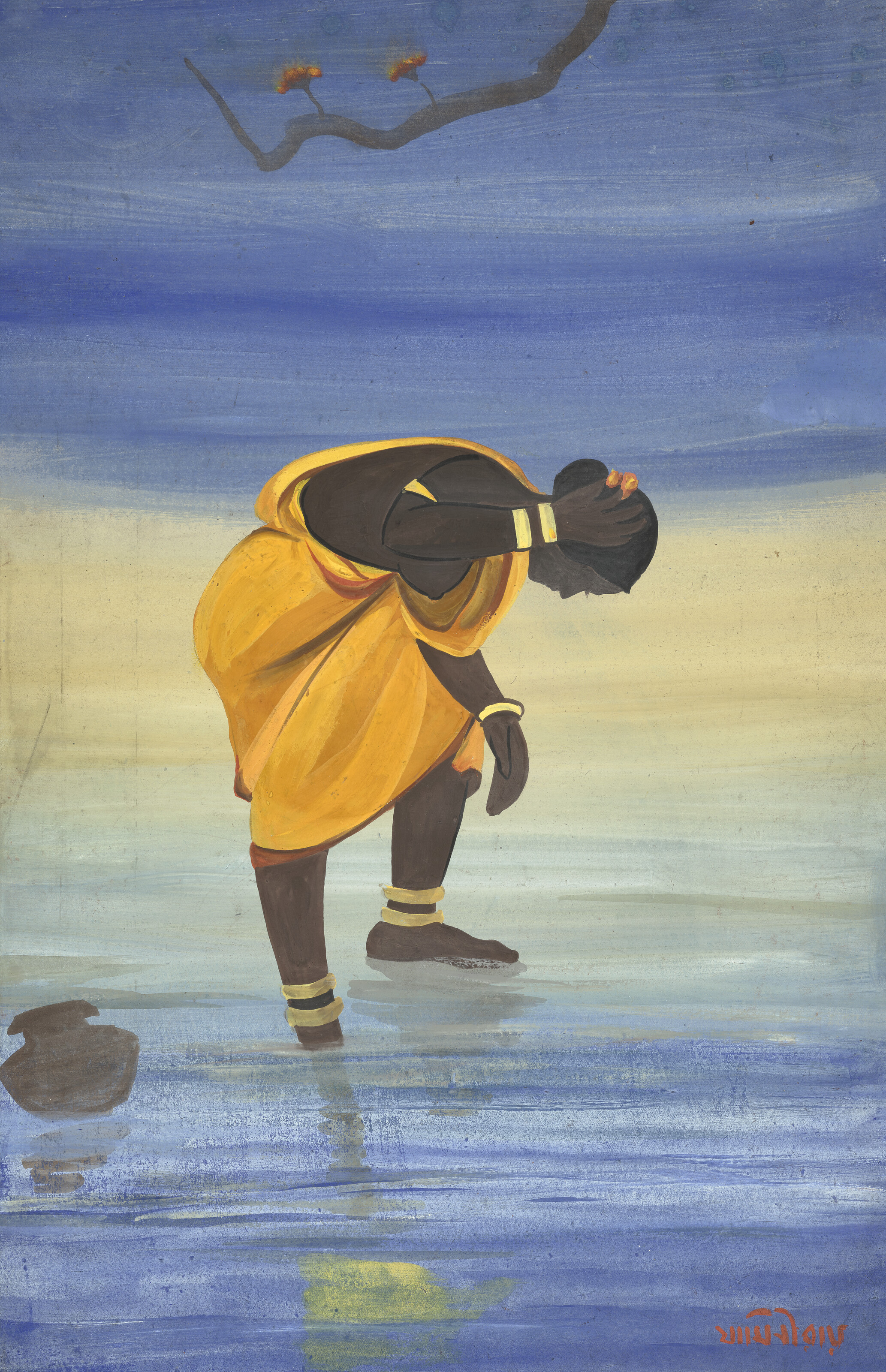 Jamini Roy's "Untitled (Santhal Girl)" exemplifies the artist's distinctive modernist style that synthesized Indian folk traditions with contemporary aesthetics. The work depicts a female subject from the Santhal indigenous community, rendered in Roy's characteristic simplified forms and bold, flattened planes of color that reflect his engagement with tribal art and rejection of Western academic painting conventions. Created during Roy's prolific career in early to mid 20th century India, the painting demonstrates his commitment to celebrating vernacular Indian culture and asserting a distinctly Indian artistic identity.