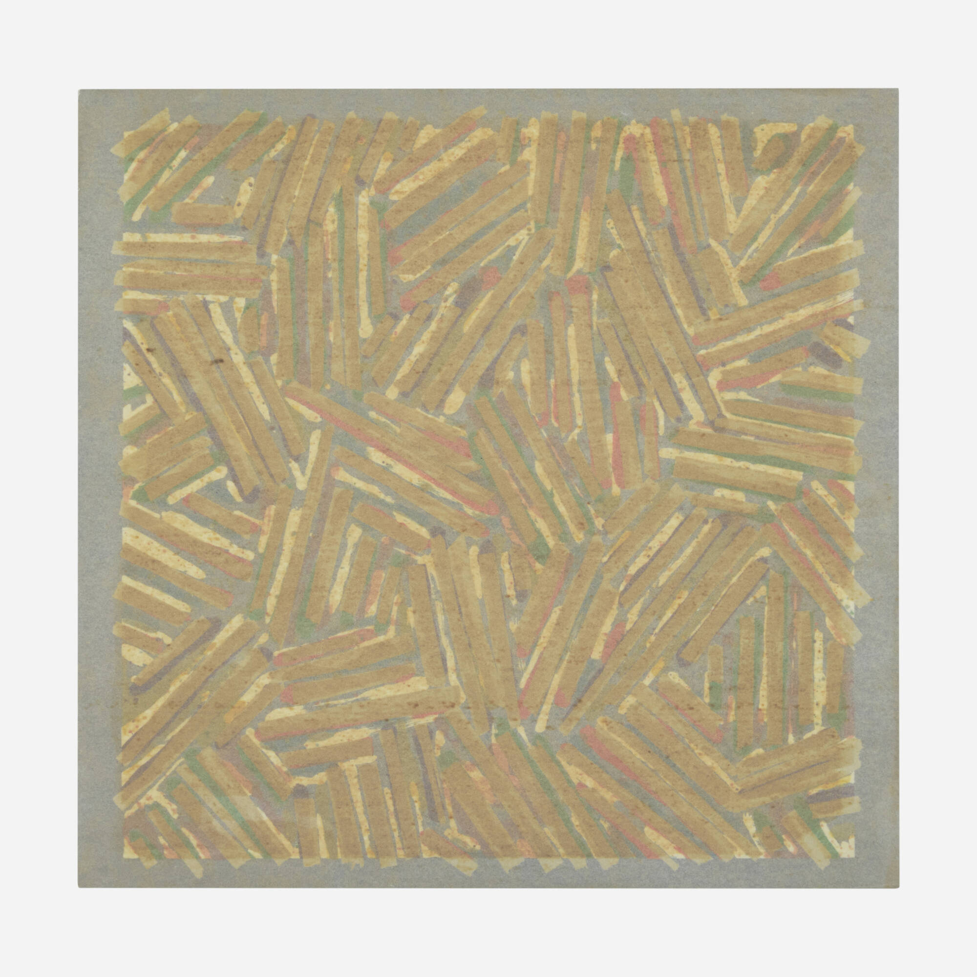 Jasper Johns created this screenprint in 1971 using a palette of colors to explore his signature cross hatch pattern. The systematic interlocking lines form a visually complex and optically engaging composition. Johns' cross hatch motif became a defining element of his artistic vocabulary during this period. The screenprint medium allows for precise color registration and vibrant hues in the work. This piece exemplifies Johns' interest in pattern, repetition, and visual perception.