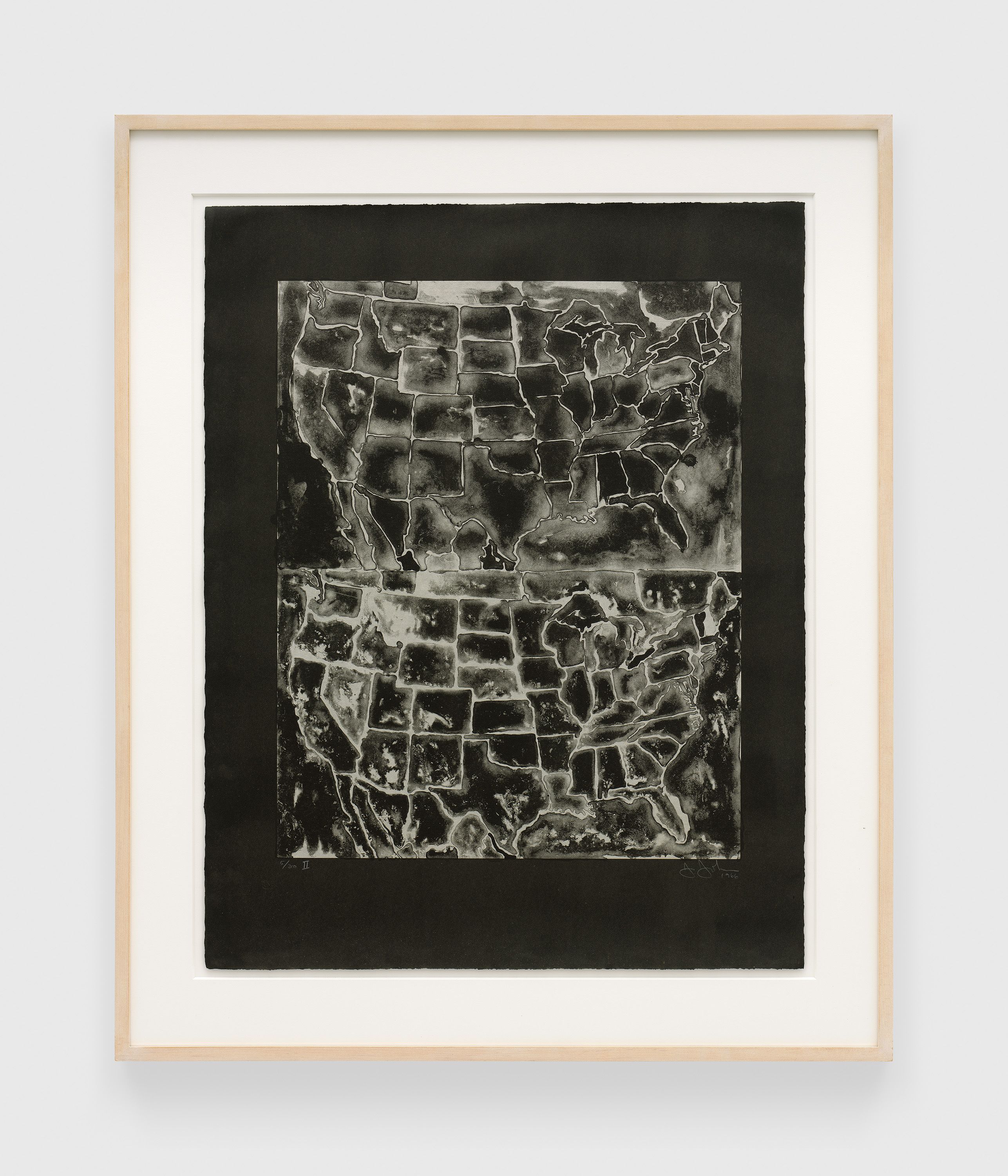 A lithographic work exploring dual cartographic representations and mapping systems. Johns creates a dialogue between geography, representation, and artistic interpretation through layered imagery.