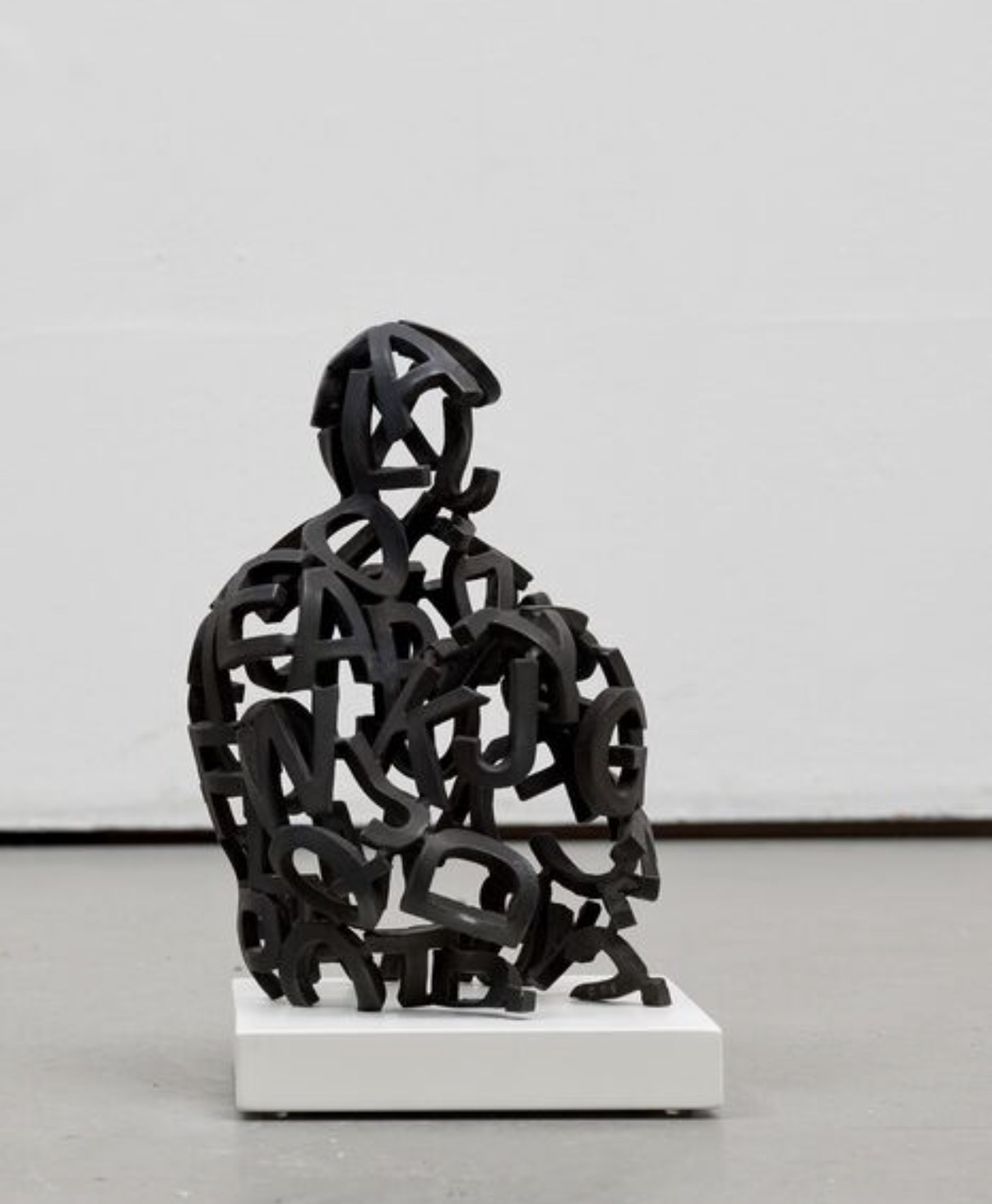 A matte black bronze sculpture depicting a seated human figure composed entirely of interlocking typographic letters and characters, forming a dense, open-lattice silhouette. The figure appears contemplative, referencing the poet Rainer Maria Rilke through Plensa's signature visual language of language-as-body. Edition 1/8, hand-signed and numbered P-1/8 by the artist, with two Certificates of Authenticity included. The work comes from a private collection in Madrid and is in perfect condition.