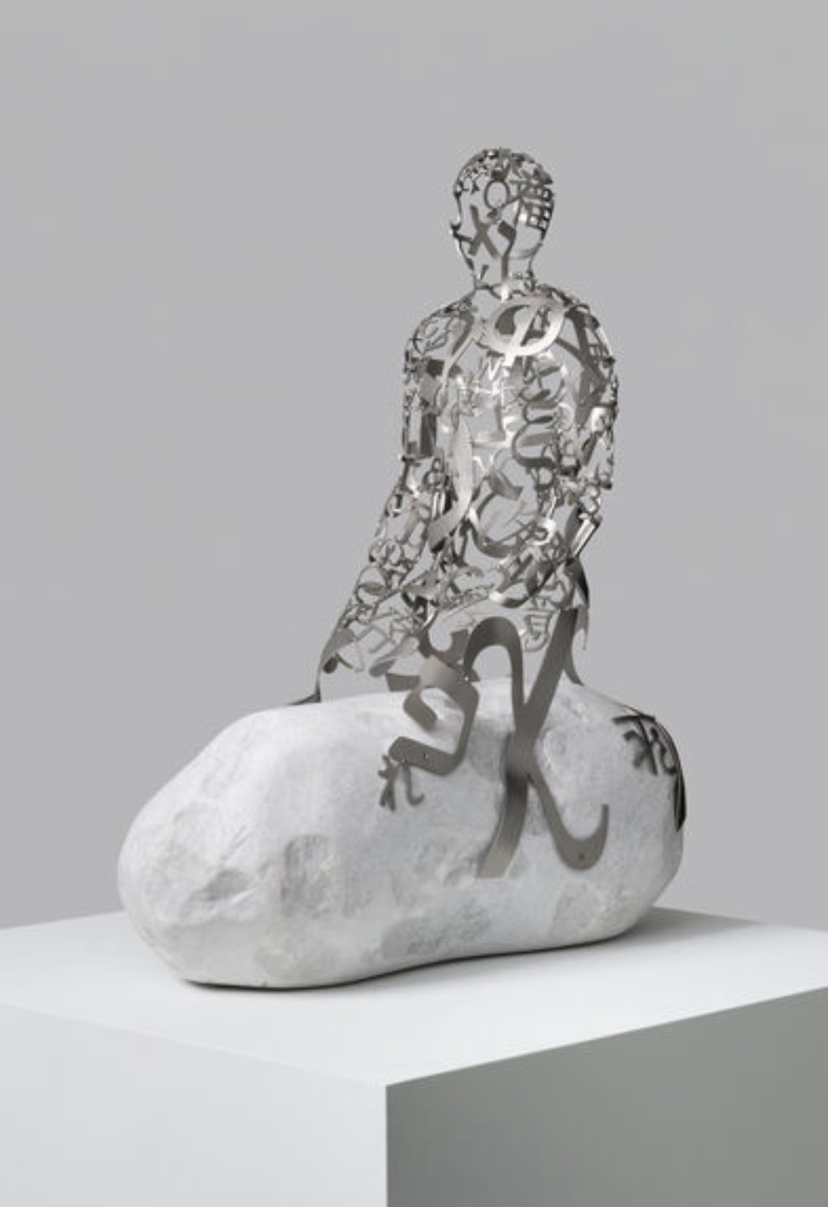 A captivating sculptural work by acclaimed Spanish artist Jaume Plensa, known for his monumental public art installations worldwide. This unique piece features Plensa's signature openwork figure composed of letters and mathematical symbols in stainless steel, seated contemplatively upon a white marble stone base. The intricate cutout design creates a translucent human form that explores themes of communication, knowledge, and the human condition—hallmarks of Plensa's celebrated practice.