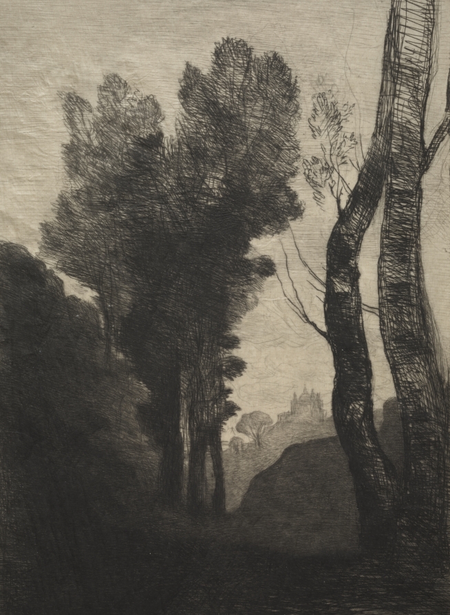 Capturing the luminous atmosphere of the Roman countryside, this etching demonstrates Corot's mastery of tonal gradations and his ability to translate his plein air sensibilities into the intimate medium of printmaking.