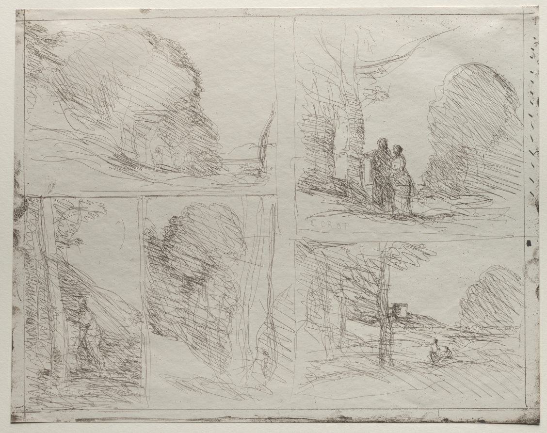 Five separate cliché-verre compositions showcase Corot's experimental approach to this hybrid photographic-artistic technique, blending drawing with light-sensitive processes.