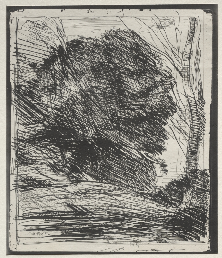 Rendered through cliché-verre, this landscape exemplifies Corot's ability to capture the essence of natural forms with economical yet expressive mark-making, achieving remarkable depth through simple tonal relationships.