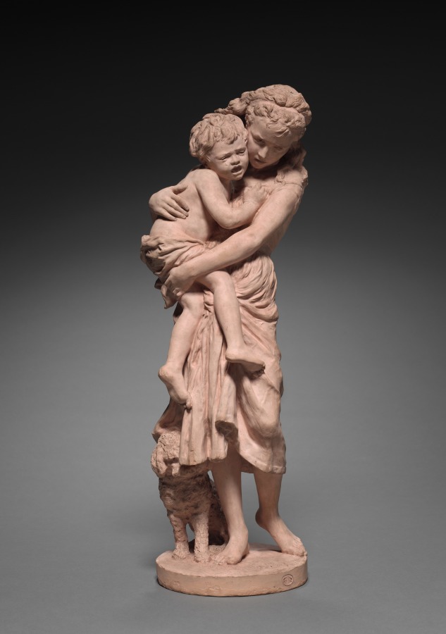Modeled in warm terracotta, this intimate family group showcases Carpeaux's tender approach to domestic subjects and his mastery of the clay medium.