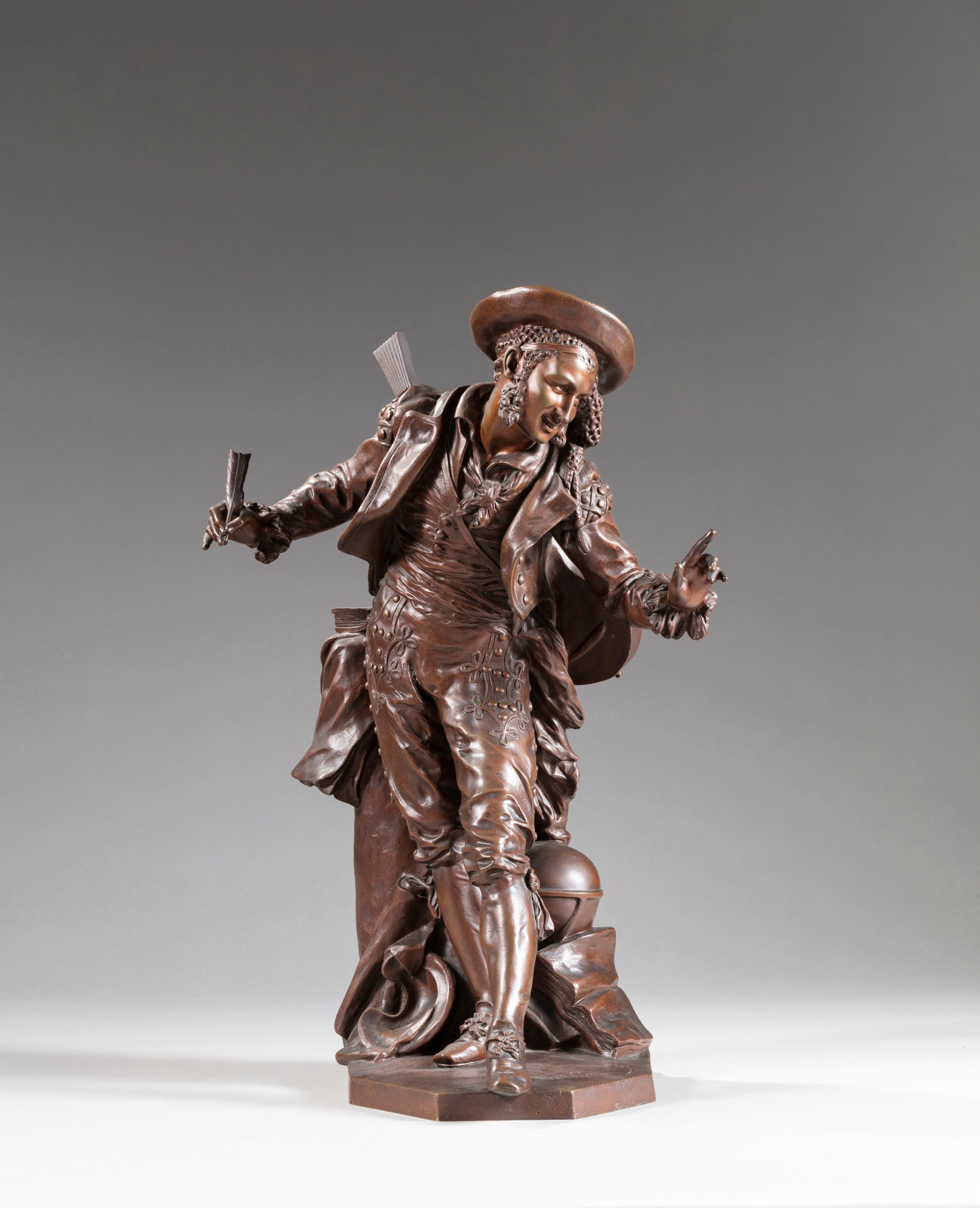 A bronze sculptural portrait bust with a golden-brown patina, representing the character Figaro. Created by the renowned 19th-century sculptor Carpeaux.