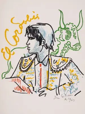 Cocteau's "Taureaux" is a masterwork of the deluxe livre d'artiste genre, comprising 31 lithographs that capture the drama and mythology of bullfighting through the artist's characteristic linear style and dynamic compositions. This 1963 limited edition, one of only 60 deluxe copies printed by the renowned Mourlot workshop on BFK Rives paper, represents the height of French fine art book production with its 18 full-page color lithographs and accompanying separate suite. The work exemplifies Cocteau's ability to infuse ancient themes with modernist sensibility, transforming the corrida into a vehicle for exploring the eternal struggle between man and beast.