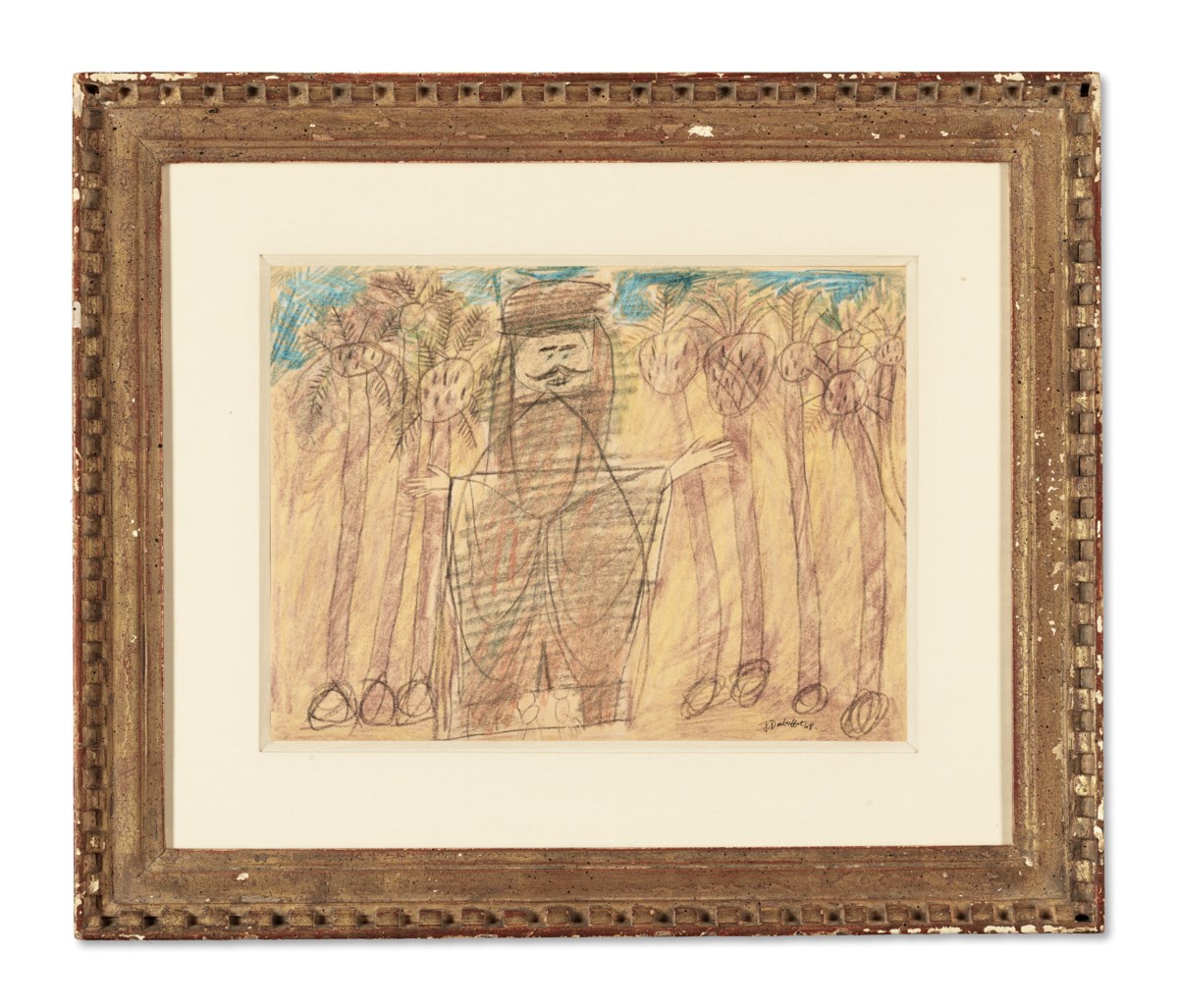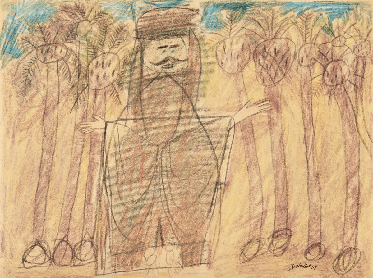 A vibrant and energetic composition rendered in colored crayon and pastel on paper, this work showcases Dubuffet's characteristic raw, gestural style rooted in his Art Brut philosophy. A lone Bedouin figure is depicted among eight palm trees in a flattened, almost childlike visual language that deliberately rejects academic convention. The bold, unrefined lines and vivid color contrasts evoke the heat and rhythm of a desert landscape while celebrating the immediacy of unmediated artistic expression.