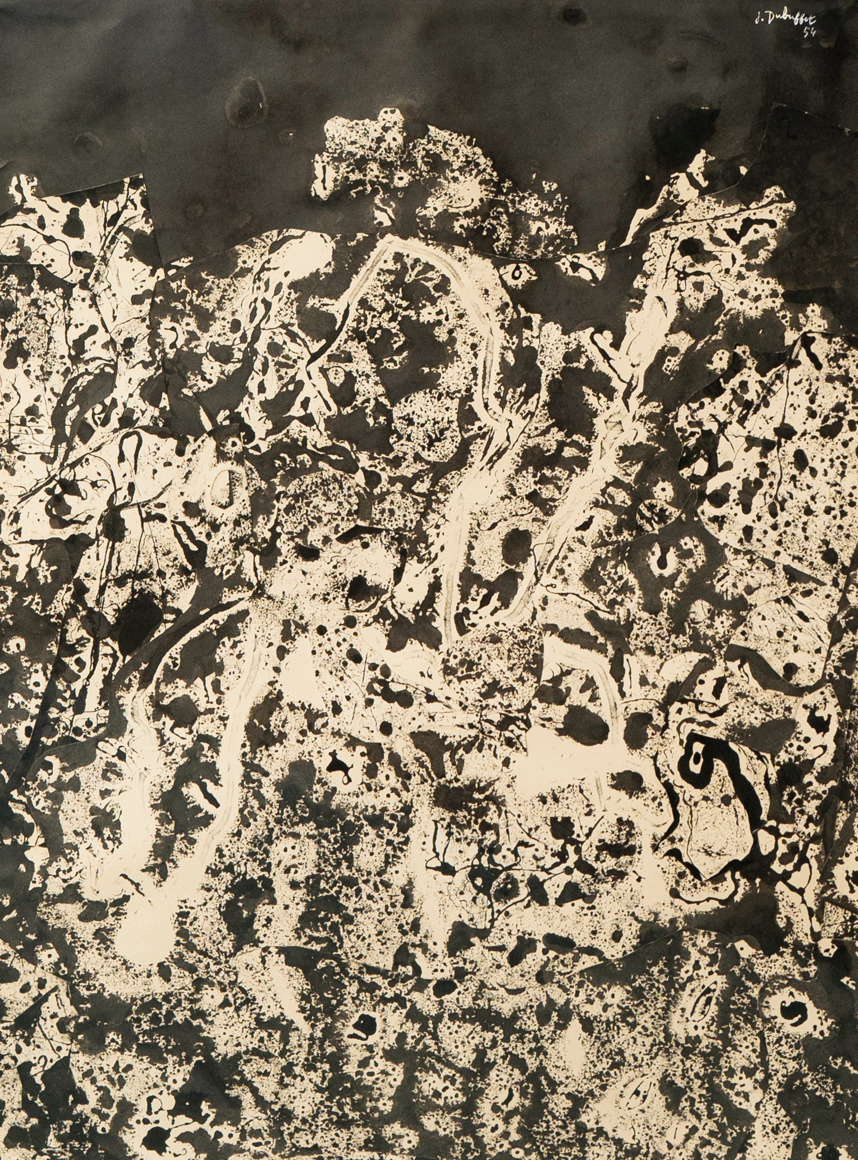 Created in 1954, Jean Dubuffet's *La Forêt* is a dynamic collage and Indian ink work on paper that reflects his signature Art Brut aesthetic. Torn and assembled paper fragments are layered with bold, gestural ink marks to evoke the dense, tangled energy of a forest. The composition eschews traditional representation in favor of a raw, primal visual language that blurs the boundary between figuration and abstraction.
