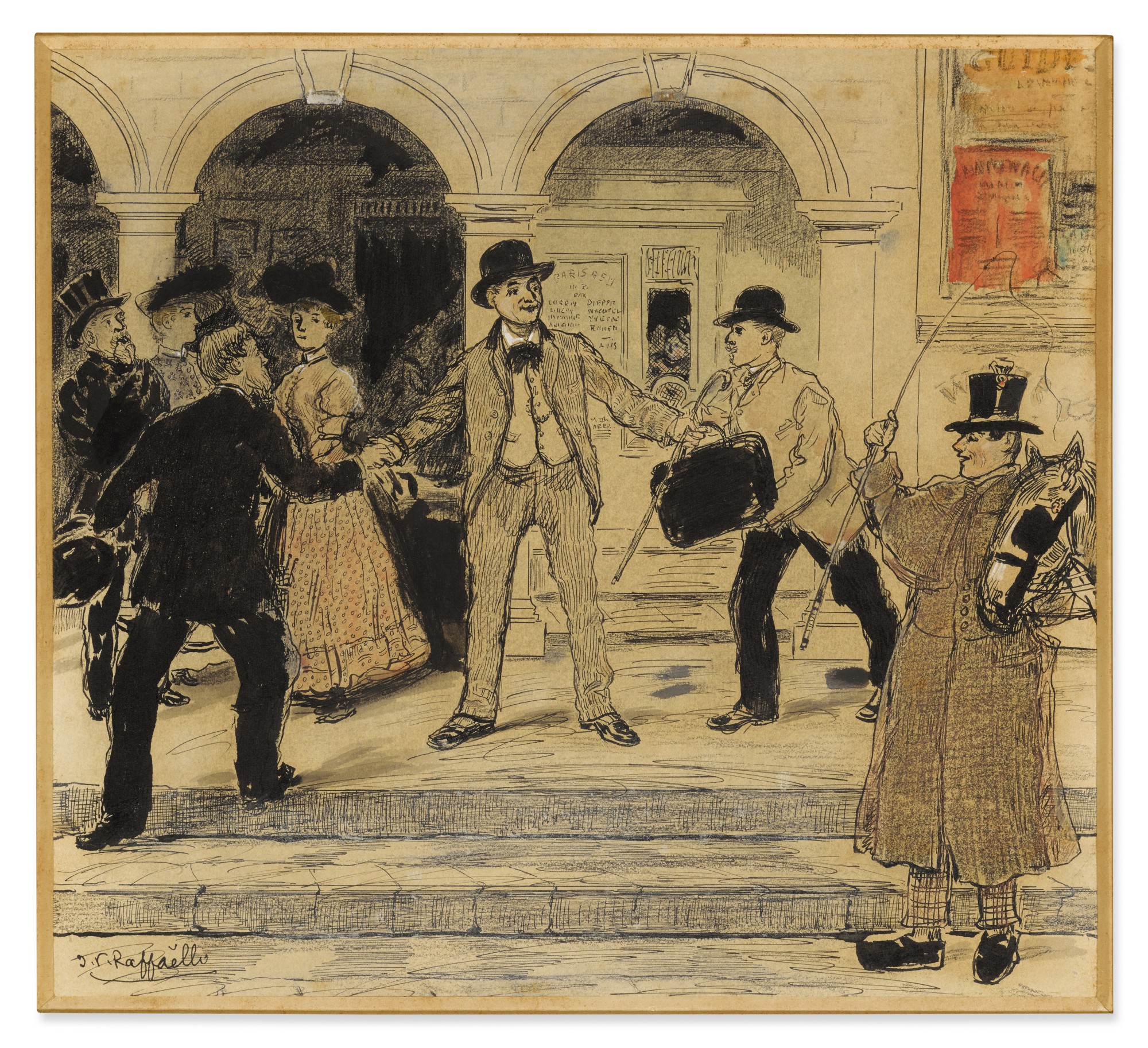 A mixed-media drawing by Jean-François Raffaëlli depicting a comedian arriving in a provincial town. The work combines pen, ink, crayon, and watercolor to capture a narrative moment with impressionistic detail.