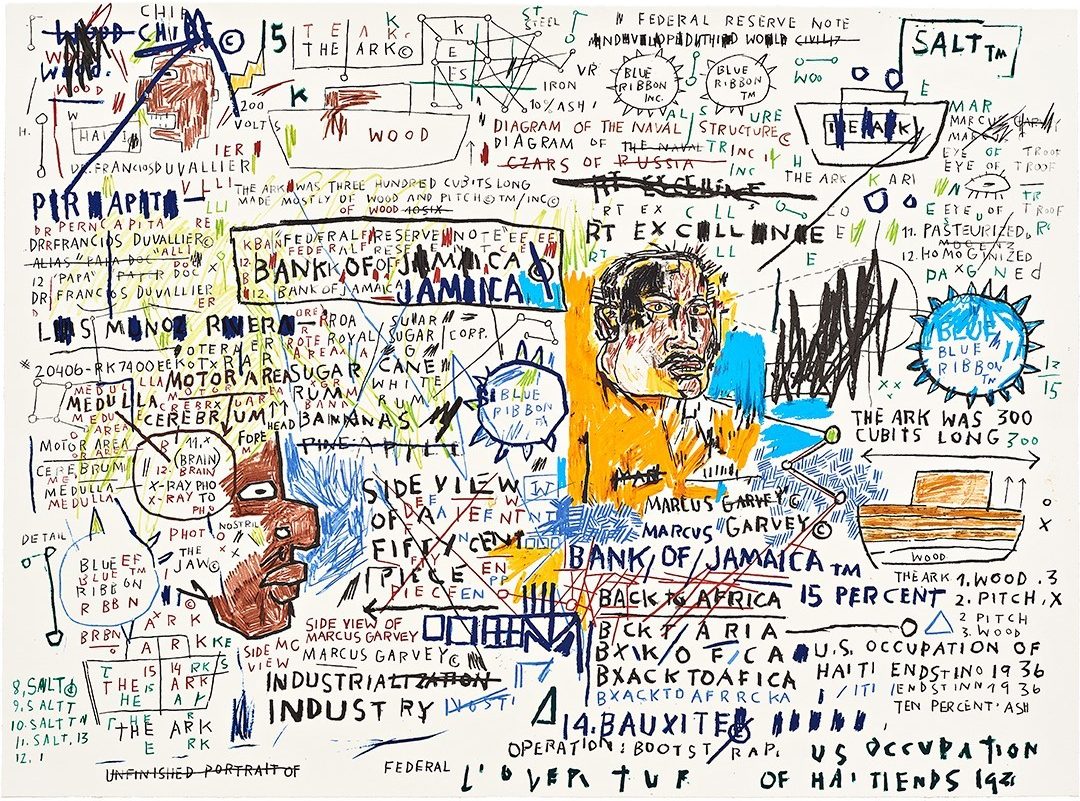 This 1982 screenprint demonstrates Basquiat's early exploration of printmaking, translating his signature raw energy and social commentary into the medium's mechanical precision. The work's title references American currency, reflecting the artist's ongoing critique of capitalism and commodification that would become central to his practice throughout the 1980s.