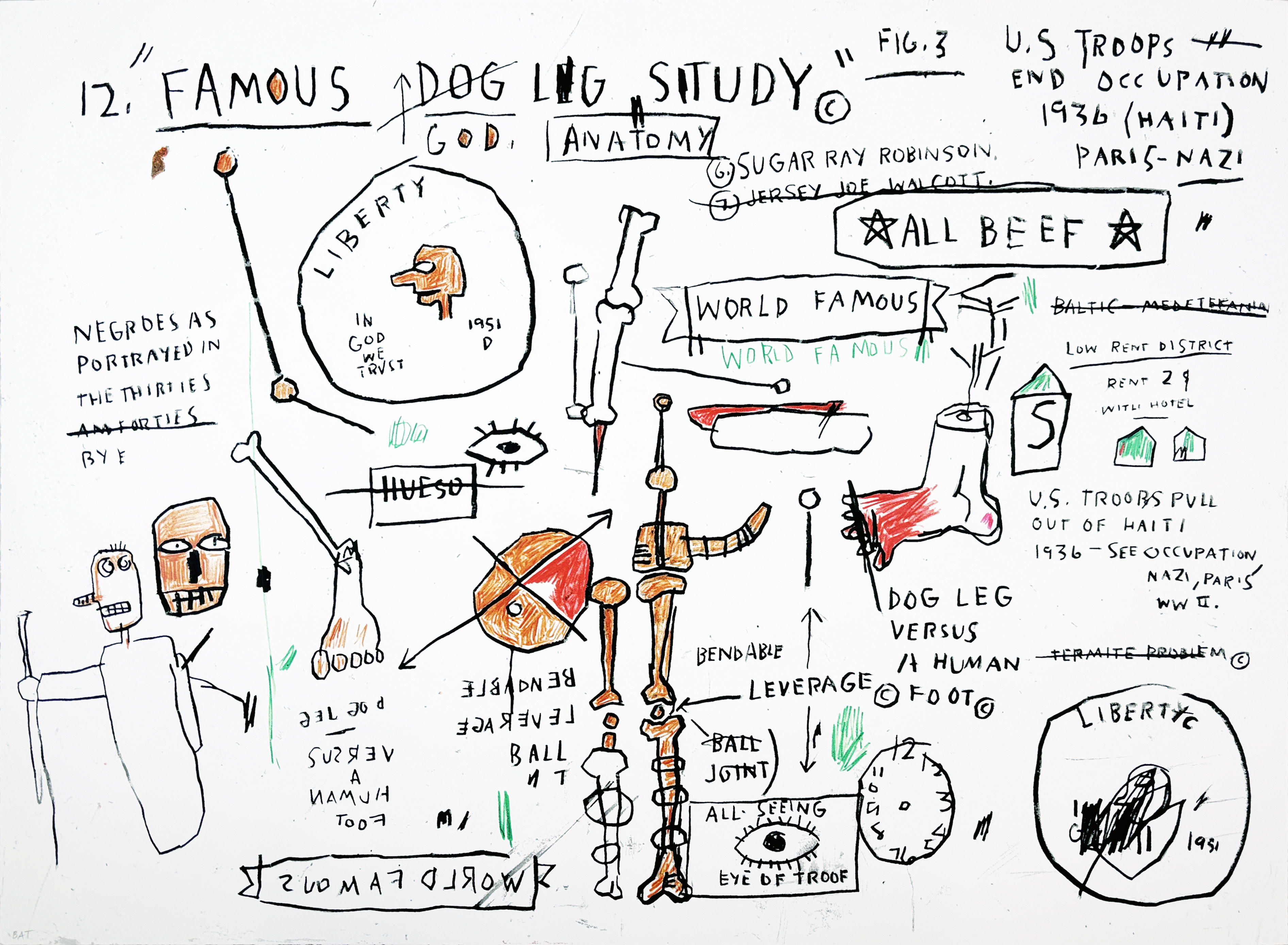 This rare 1982 silkscreen demonstrates Basquiat's early experimentation with printmaking techniques, translating his characteristic raw energy and anatomical imagery into the precision of editioned works. Part of a limited series of fifty, "Dog Leg Study" exemplifies the artist's interest in fragmented body parts and medical imagery that would become central themes throughout his career.