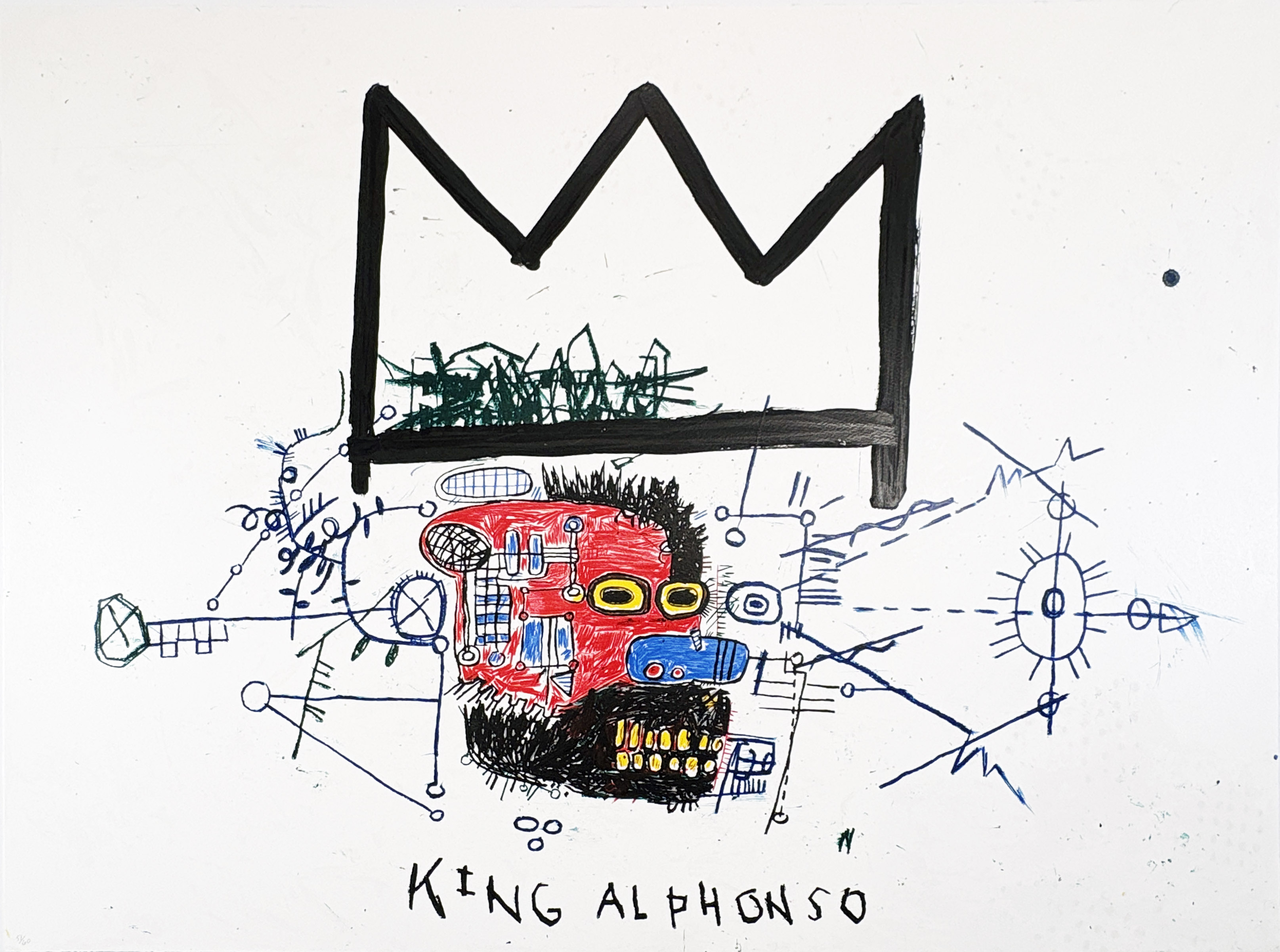This serigraph showcases Basquiat's signature neo-expressionist style through bold graphic translation, featuring his characteristic crown motif and raw figurative elements that celebrate Black identity and power. The print medium allows for crisp reproduction of his distinctive text-image integration and vibrant color palette that defined his exploration of African diaspora themes.