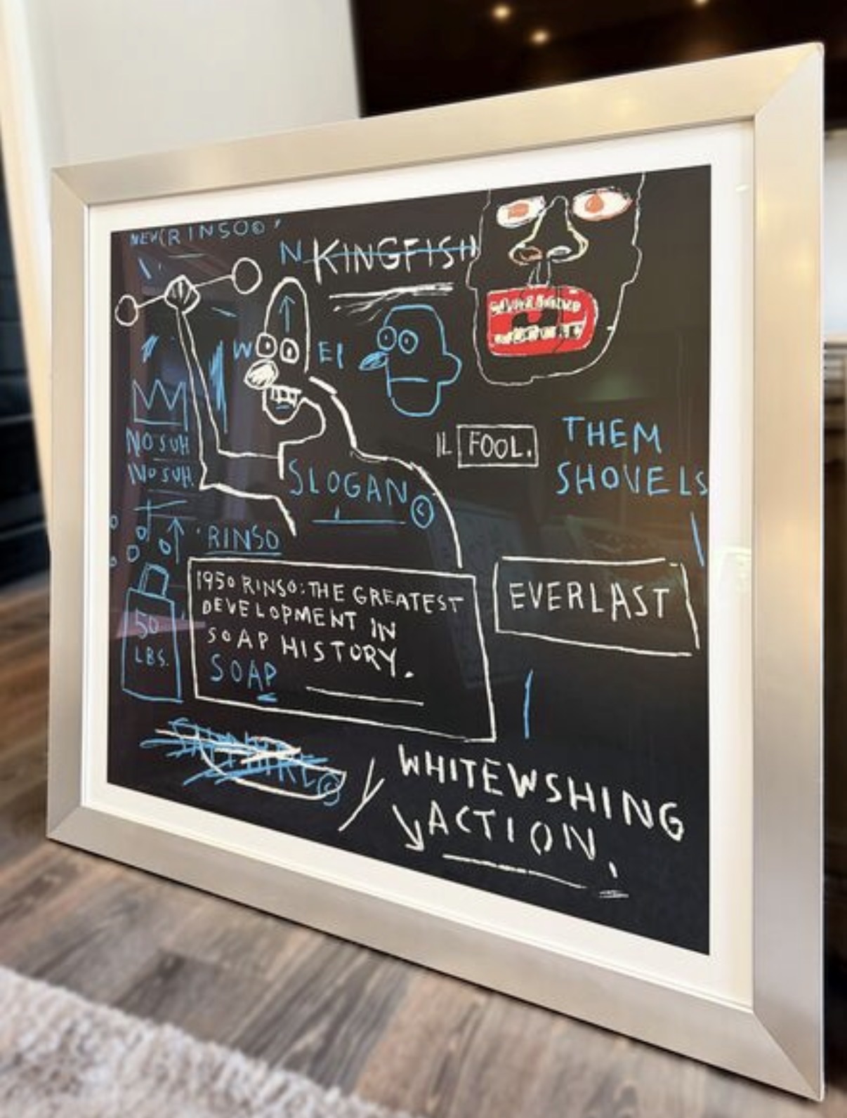 Screenprint in colors on Saunders 410 Hot Press paper (or Lenox Museum Board). Frame included — shows light, soulful wear at corners. Part of a limited edition set (Portfolio I). Two Certificates of Authenticity included: one issued by gallery, one issued by authorized authenticating body. Signed by Gerard Basquiat with official Estate & Publisher stamps.