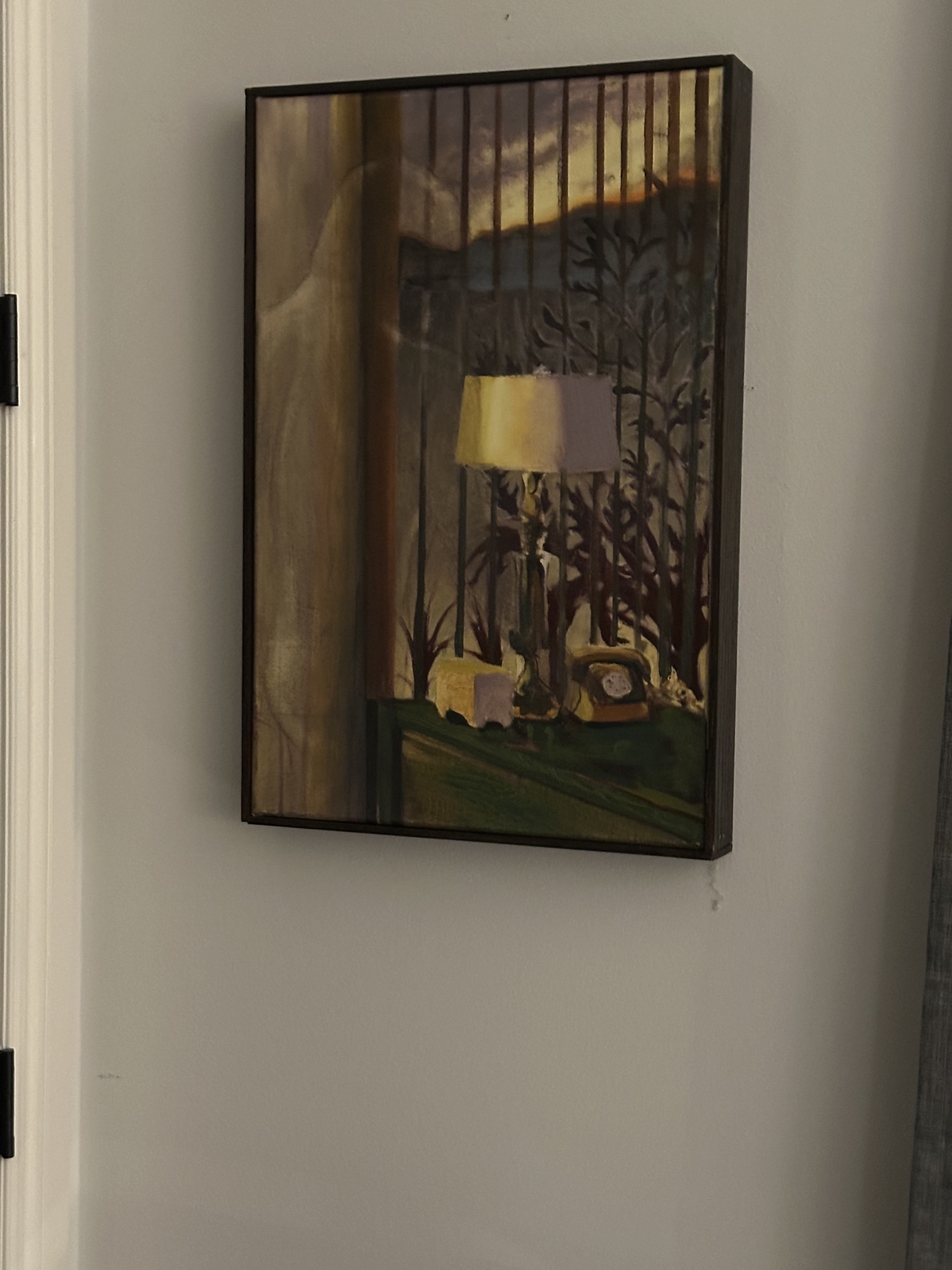 A moody interior scene depicting a vintage telephone and illuminated lamp on a green surface, with silhouetted plants visible through vertical bars or railings. The painting captures a nostalgic, introspective atmosphere with warm golden light contrasting against darker tones. Heiman's careful attention to everyday objects creates an intimate domestic tableau.