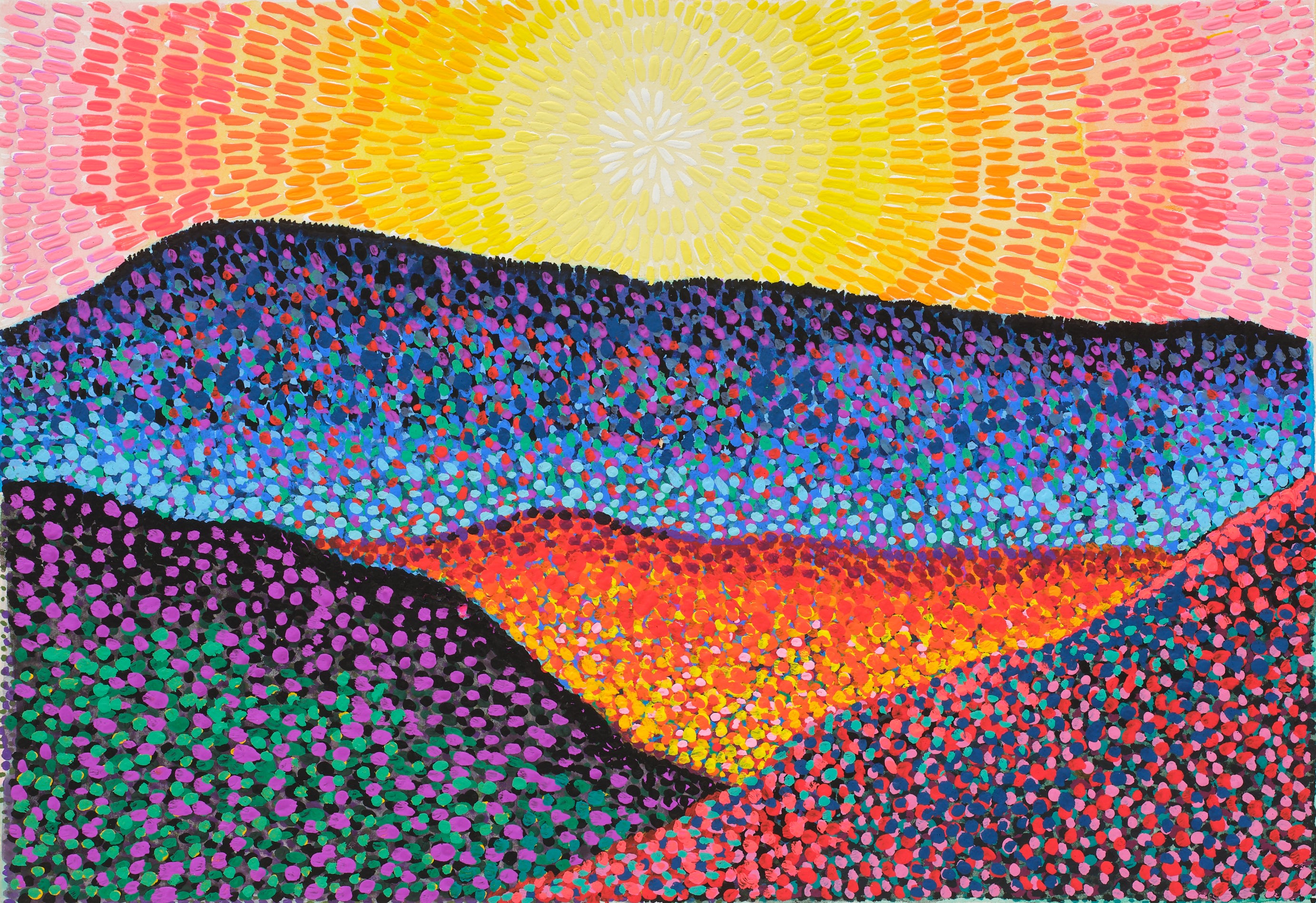 Rendered in Jennifer Guidi's signature meditative style, *Downvalley* (2025) is an intimate work in gouache on paper that evokes a sense of quiet, luminous landscape through layered, rhythmic mark-making. Soft gradations of color dissolve into one another, suggesting rolling terrain bathed in diffused light while maintaining an abstract, almost spiritual ambiguity. The delicate materiality of gouache lends the composition a matte, contemplative surface that invites close and unhurried looking.