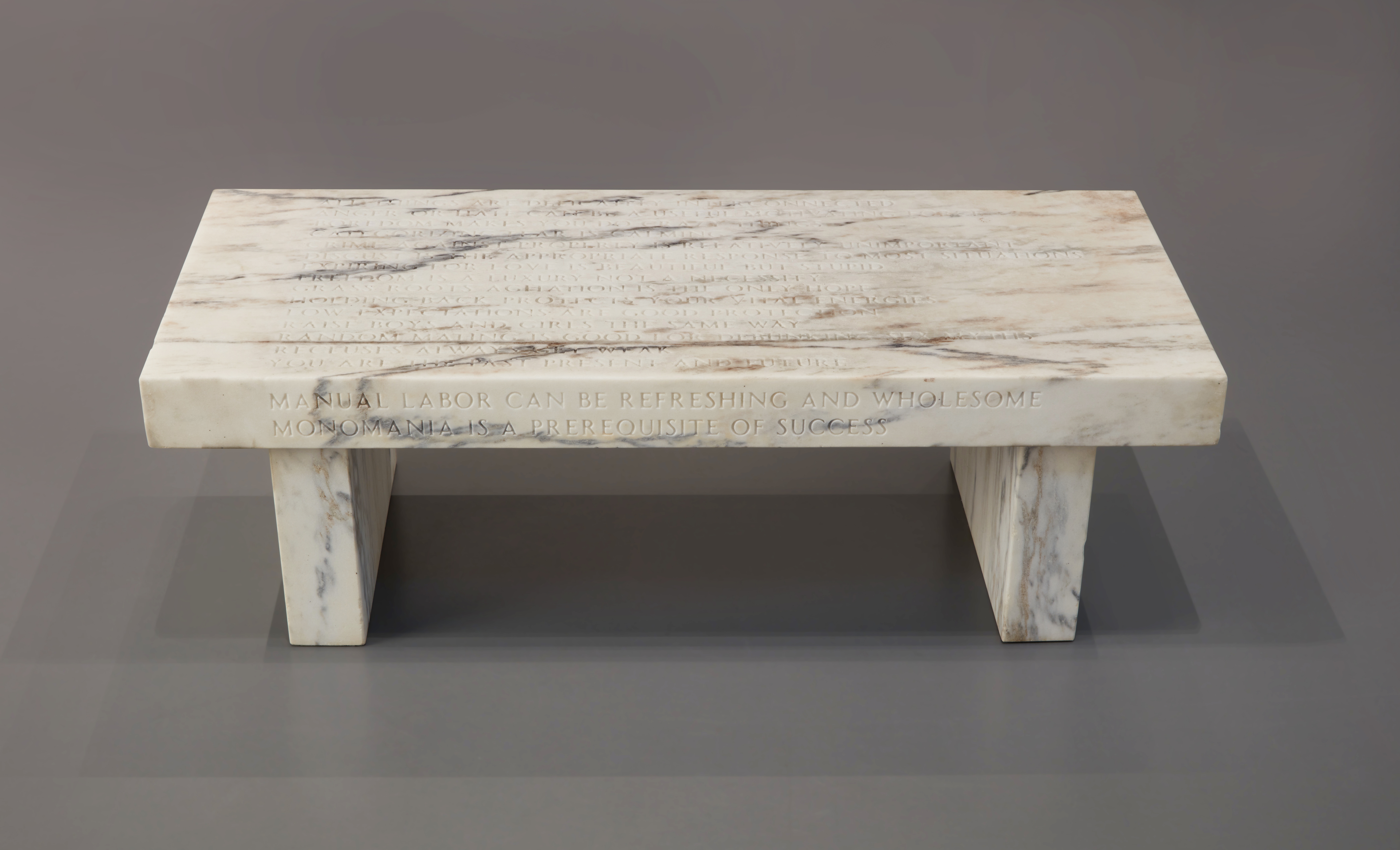 Jenny Holzer's text-based work carved into white marble, presenting her philosophical truism about the interconnectedness of all things. The piece combines language and stone to explore concepts of unity and relationship.