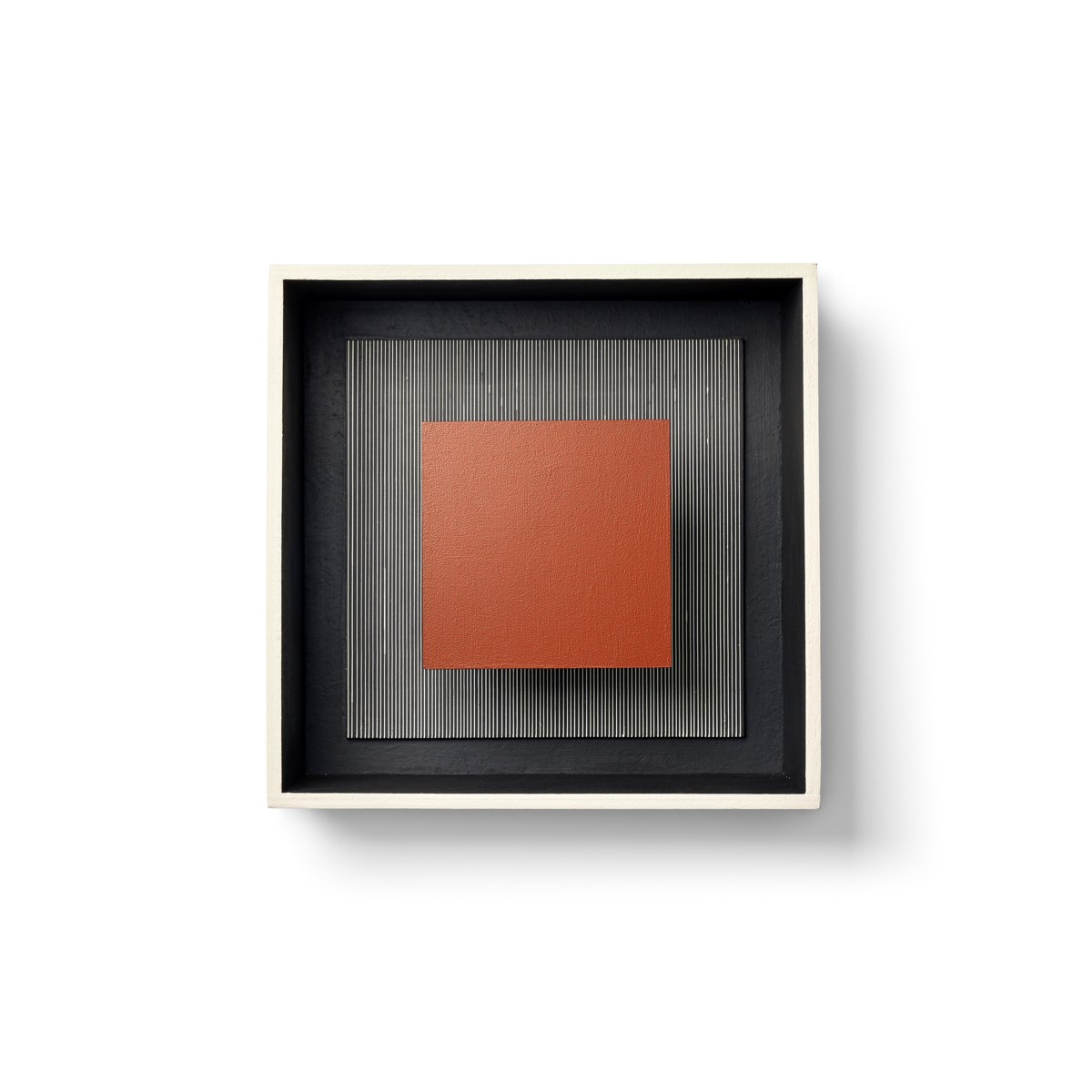 Created by Venezuelan kinetic and op art master Jesús Rafael Soto, this untitled work combines acrylic paint applied to metal plate and wood to generate his signature interplay of optical movement and spatial illusion. The juxtaposition of industrial and natural materials reflects Soto's enduring exploration of the relationship between physical surfaces and perceived depth. As the viewer shifts position, the composition appears to vibrate and transform, embodying Soto's lifelong investigation into the dynamic nature of visual perception.