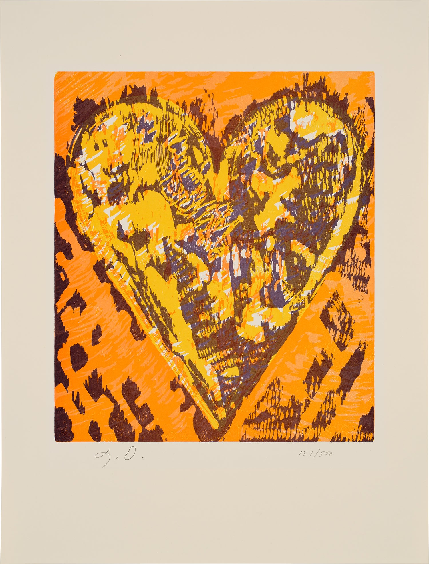 Jim Dine's 'Heart for Film Forum' is a woodcut in colors on Mohawk Superfine Cover paper, part of his extended series exploring the heart motif (C. 60). The work demonstrates Dine's mastery of traditional printmaking techniques combined with expressionistic color. The heart image functions as both a personal and universal symbol within his artistic practice.