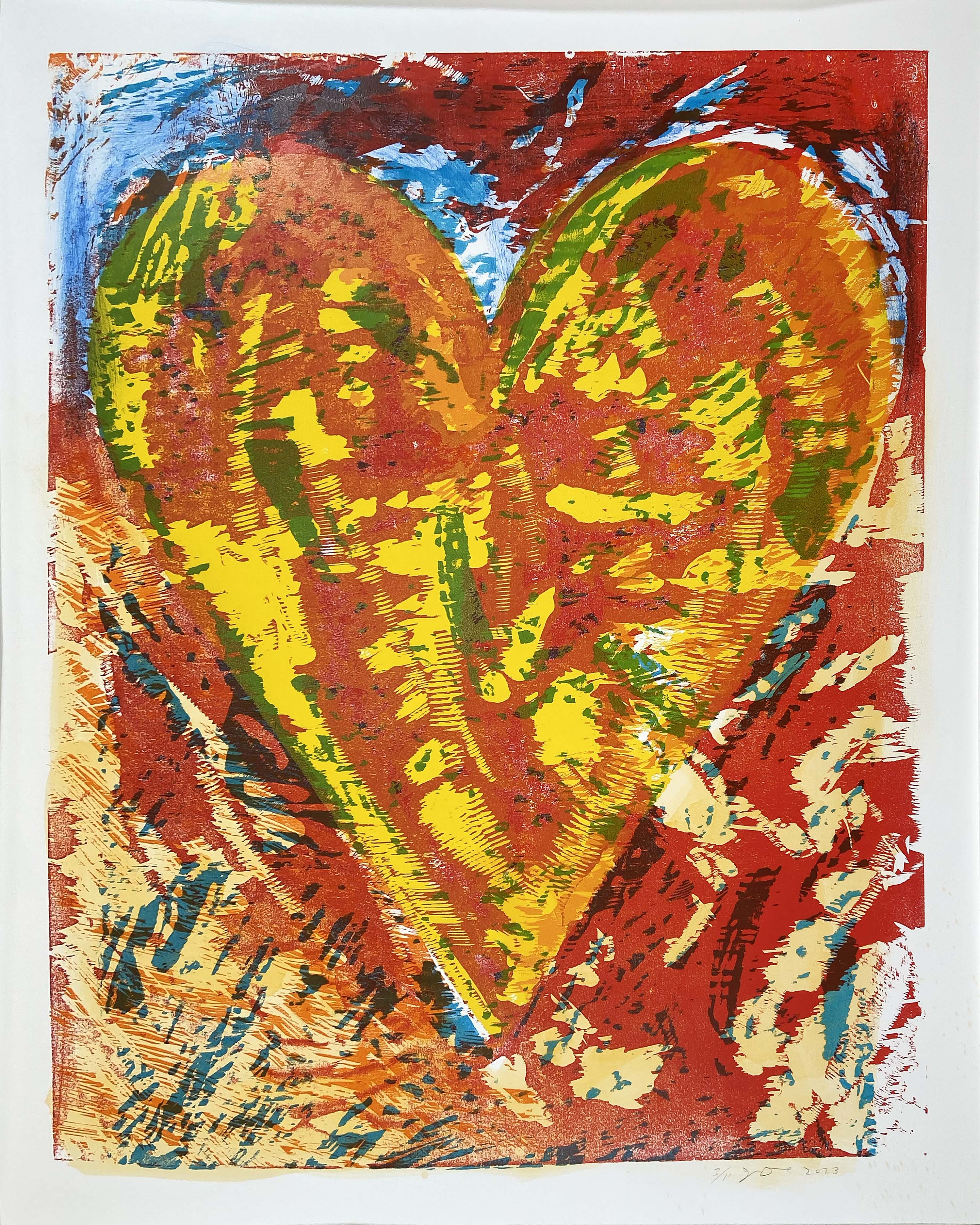 This hand-colored woodcut exemplifies Dine's masterful integration of printmaking with gestural painting, as acrylic and charcoal additions transform the traditional medium into a hybrid work. The rose motif continues the artist's decades-long exploration of symbolic imagery, rendered here with the tactile immediacy that defines his most compelling recent works.