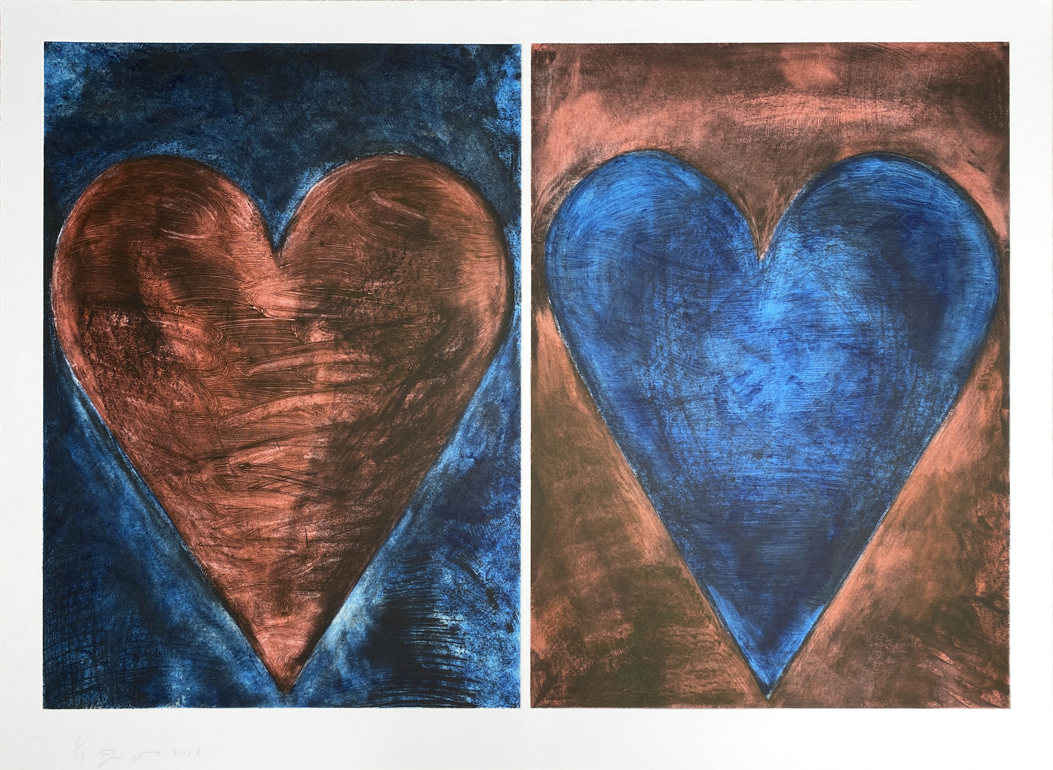 This 2010 work combines Dine's mastery of printmaking techniques, employing both collograph and intaglio methods on premium Hahnemuhle paper to create rich textural contrasts. Part of a limited edition of 15, "The Magnets" likely explores Dine's recurring fascination with symbolic objects and their emotional resonance, rendered through his characteristic bold, expressive mark-making.