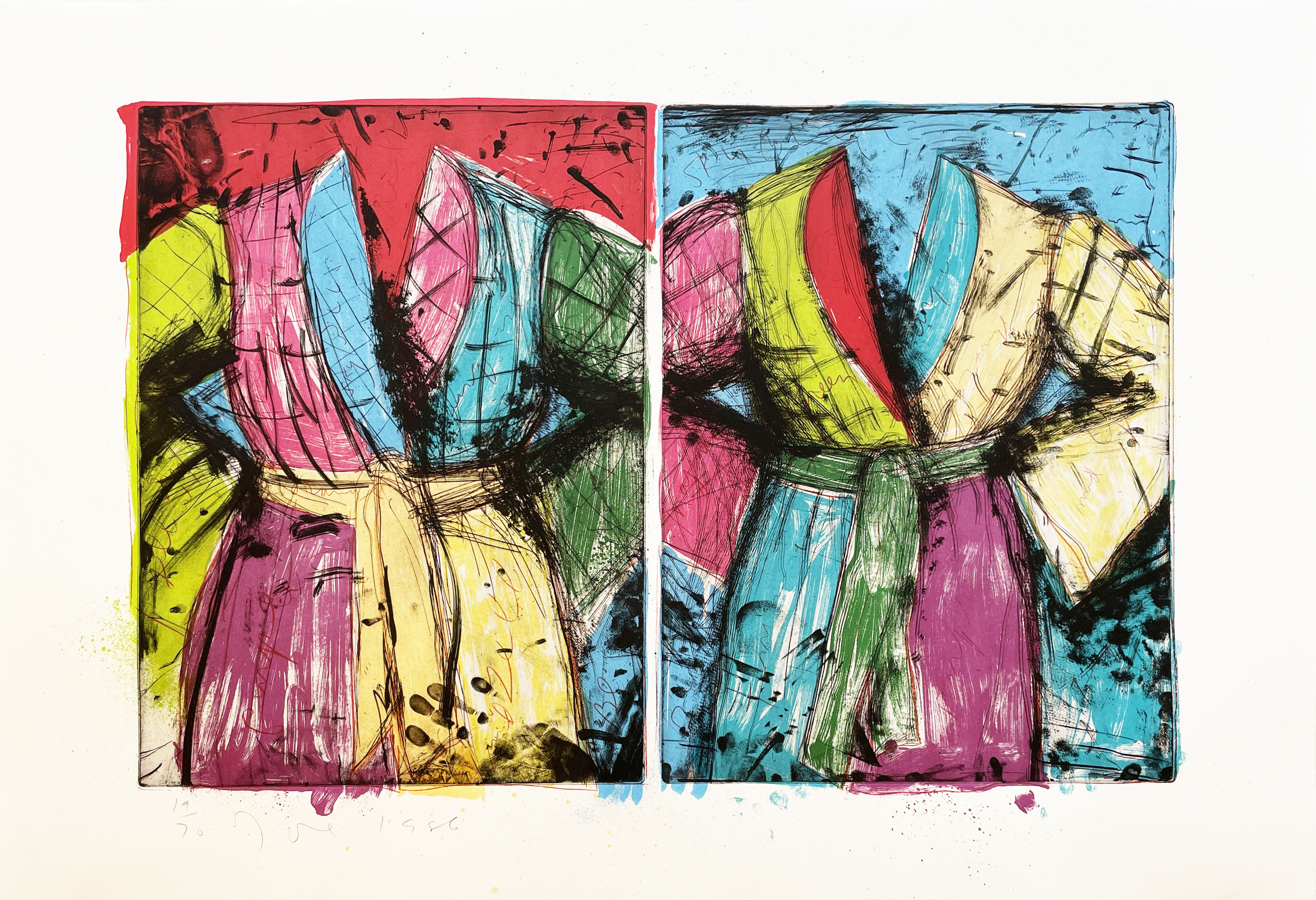 This dual-image print exemplifies Dine's iconic bathrobe motif, combining etching and lithography techniques to create two distinctly colored interpretations of his signature subject on a single sheet. The work demonstrates Dine's mastery of printmaking processes while exploring his recurring themes of intimate domestic objects as symbols of human presence and vulnerability.