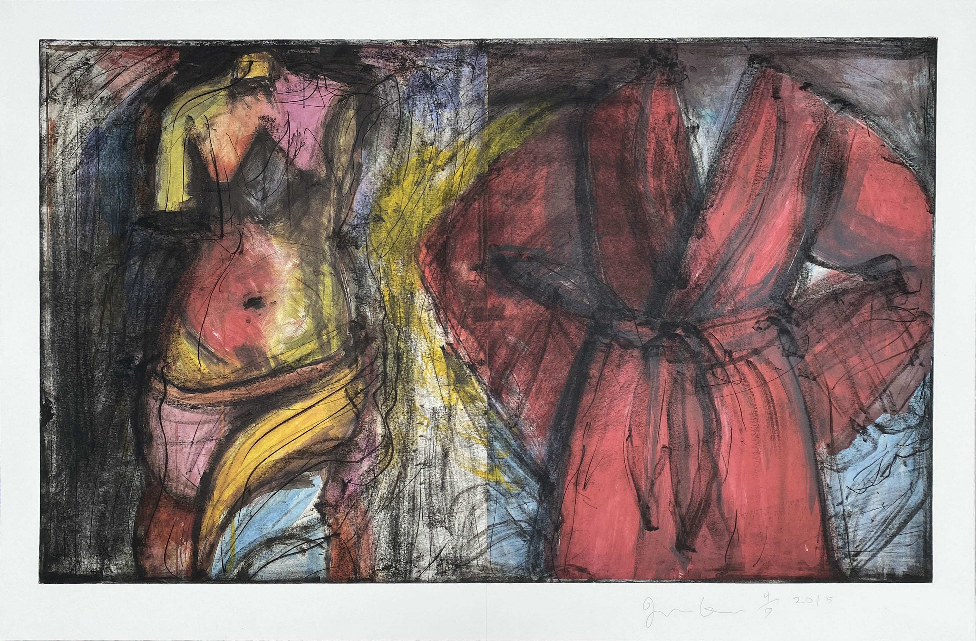 This 2015 mixed-media work combines Dine's signature printmaking expertise with gestural drawing, employing offset lithography and etching as foundations for expressive charcoal and acrylic interventions. The intimate edition of nine reflects Dine's continued exploration of memory and personal iconography, demonstrating his mastery of layered techniques that blur the boundaries between printmaking and painting.