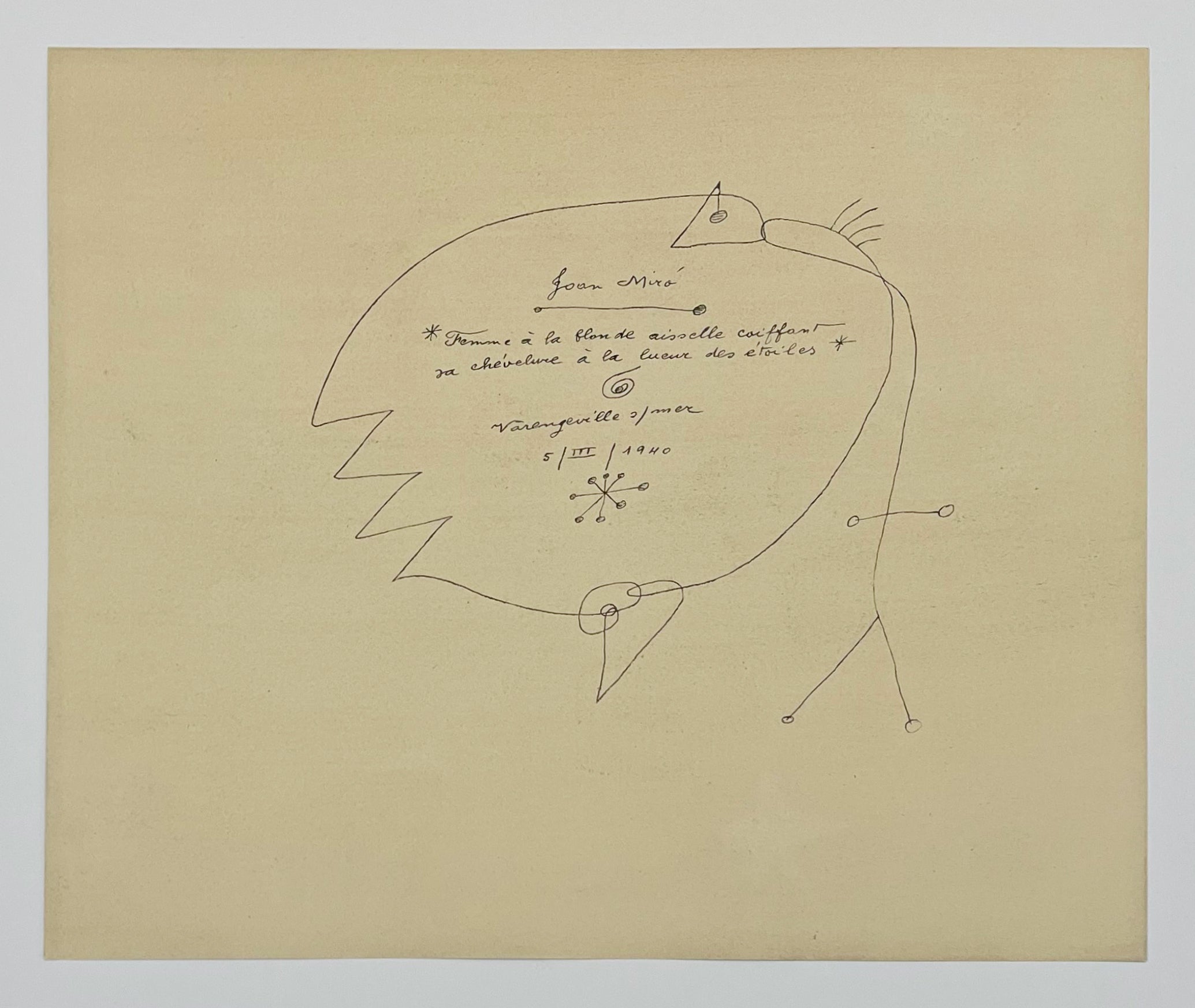 This lithograph reproduces one of Joan Miró's most playfully surreal compositions, part of a series exploring the artist's distinctive visual vocabulary of biomorphic forms and poetic abstraction. The work presents a fragmented female figure rendered through Miró's characteristic vocabulary of curved lines, organic shapes, and gestural marks, where the body dissolves into a constellation of forms that suggest movement and sensuality rather than literal representation. The title itself, with its whimsical specificity about an armpit and starlight, exemplifies Miró's approach to naming works, inviting viewers to navigate the space between linguistic absurdity and visual poetry. The composition demonstrates the artist's masterful command of lithography, a medium through which he could achieve both delicate linear passages and bold gestural marks. Working in the postwar period when Miró had refined his mature style, this print captures the essence of his investigation into how line, form, and color might evoke psychological states and bodily sensations beyond conventional representation. The work appeals to collectors seeking examples of twentieth-century modernism that balance formal sophistication with a distinctly humorous approach to the figure, embodying Miró's belief that art should engage the viewer's imagination rather than merely depict reality.