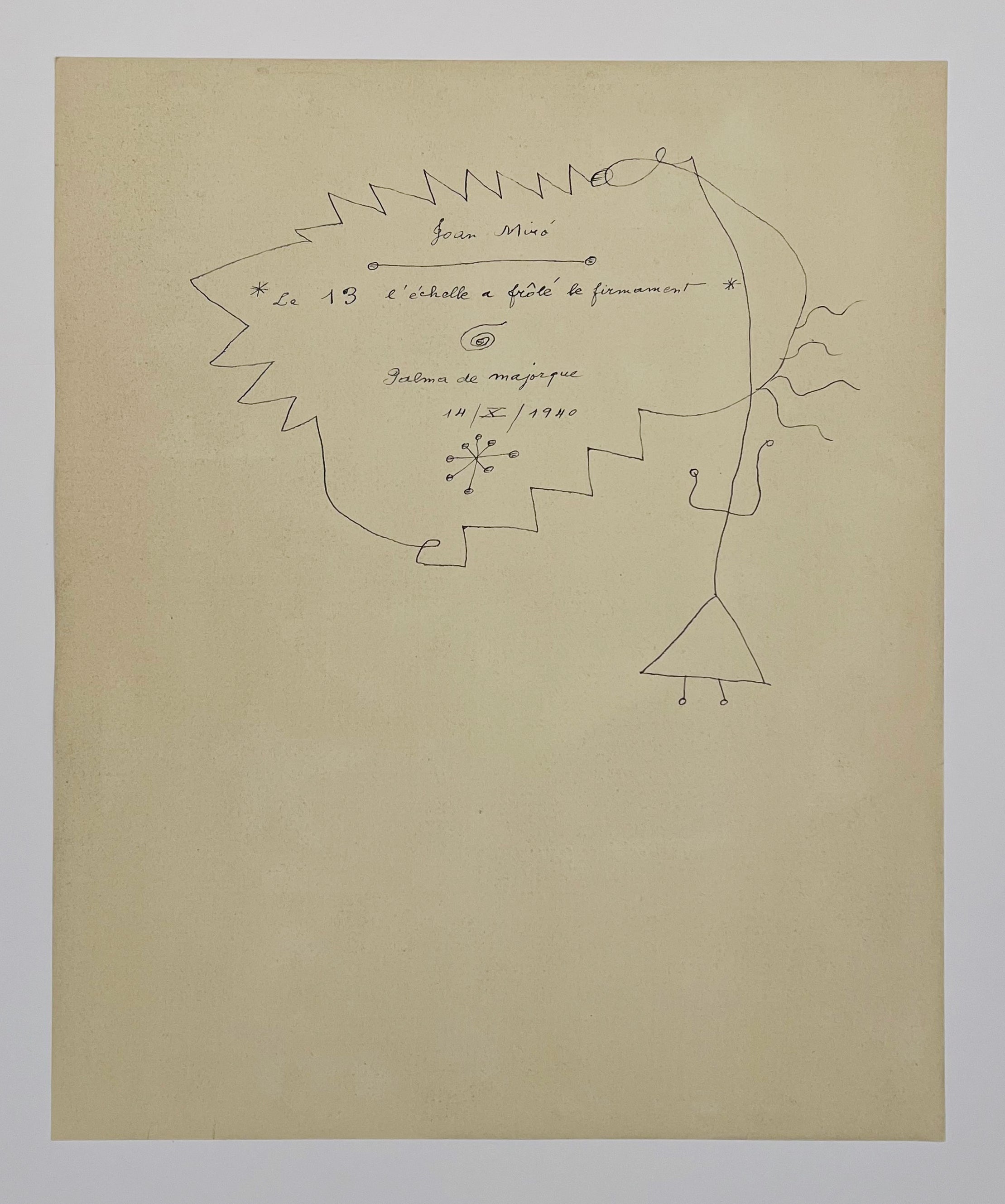 This elegant abstraction presents Miro's characteristic vocabulary of biomorphic forms and gestural marks rendered in soft tonal harmonies. The composition features delicate linear elements that seem to float across the surface, suggesting a ladder or ascending trajectory that moves toward celestial suggestion rather than literal representation. Deep blues and grays dominate the palette, creating atmospheric depth while organic shapes in ochre and cream establish a sense of movement and weightlessness. The work exemplifies Miro's ability to balance spontaneity with formal control, where seemingly random marks cohere into a cohesive poetic vision. This piece represents the kind of modernist invention that has attracted serious collectors for decades. The plate number indicates this work's place within Miro's larger conceptual project, where the recurring motif of the ladder functions as a bridge between earthly and transcendent realms. The subtle chromatic relationships and assured handling of line reveal an artist working at the height of his technical mastery, translating dreams and subconscious imagery into a visual language that remains deeply engaging. For collectors drawn to Spanish modernism and mid-century abstraction, this work offers an opportunity to acquire an important example of Miro's mature period at an accessible price point.