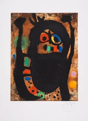"La Femme aux Bijoux" is a 1968 colored etching with carborundum by Joan Miró, an avant garde Spanish artist known for his biomorphic abstraction and playful approach to printmaking. This hors commerce impression, printed by the prestigious Maeght Éditeur in Paris, exemplifies Miró's characteristic use of organic forms and vibrant color to suggest a figure adorned with jewels. The work's substantial size of 746 by 585 millimeters and printing on fine Mandeure Rag paper underscore its significance as a major print from the artist's prolific later career.