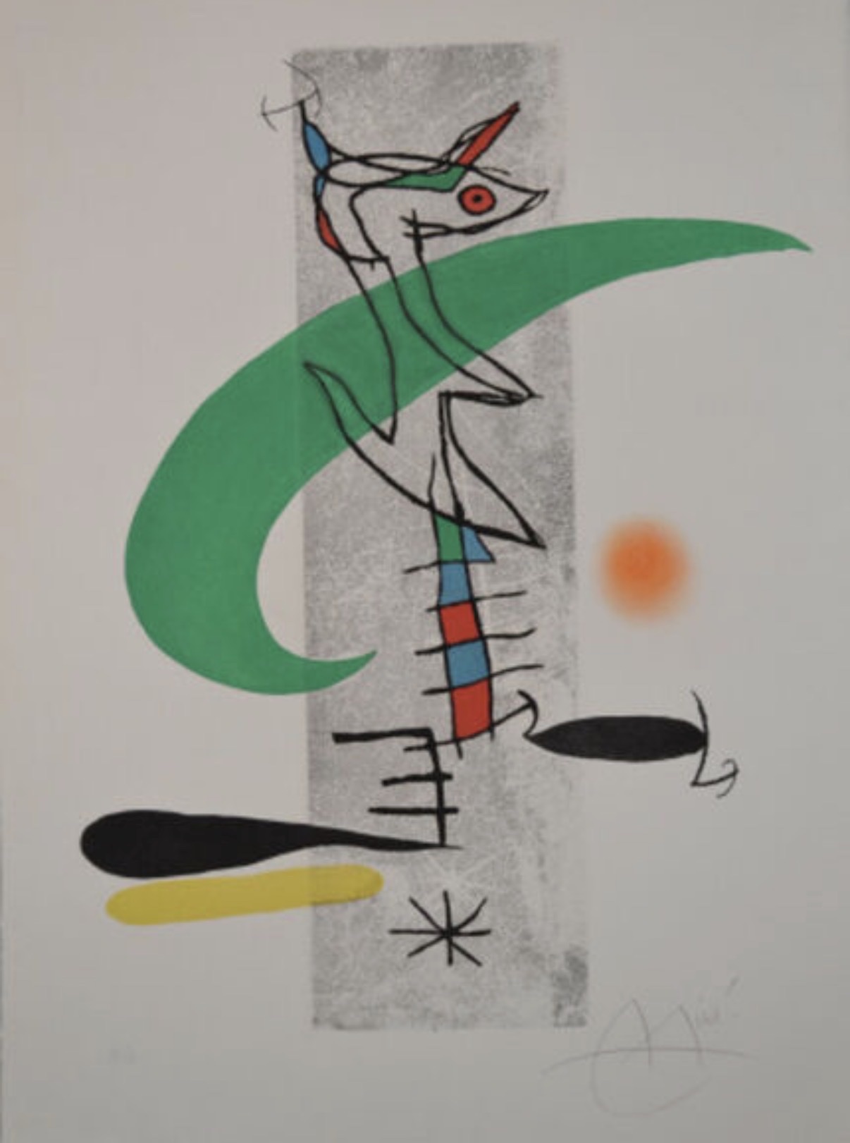 A vibrant color etching and aquatint by Joan Miró, featuring his signature biomorphic figures and surrealist vocabulary: a fantastical creature rendered in black line work against a textured grey ground, animated by bold sweeps of green, red, blue, yellow, and orange. The composition showcases Miró's characteristic interplay of gestural marks, celestial symbols, and pure color shapes floating in open space. Hand-signed and numbered 38/50 in pencil in the lower margin, this impression was printed by Morsang, Paris, with full margins intact. A strong example from Miró's mature printmaking practice of the 1970s.