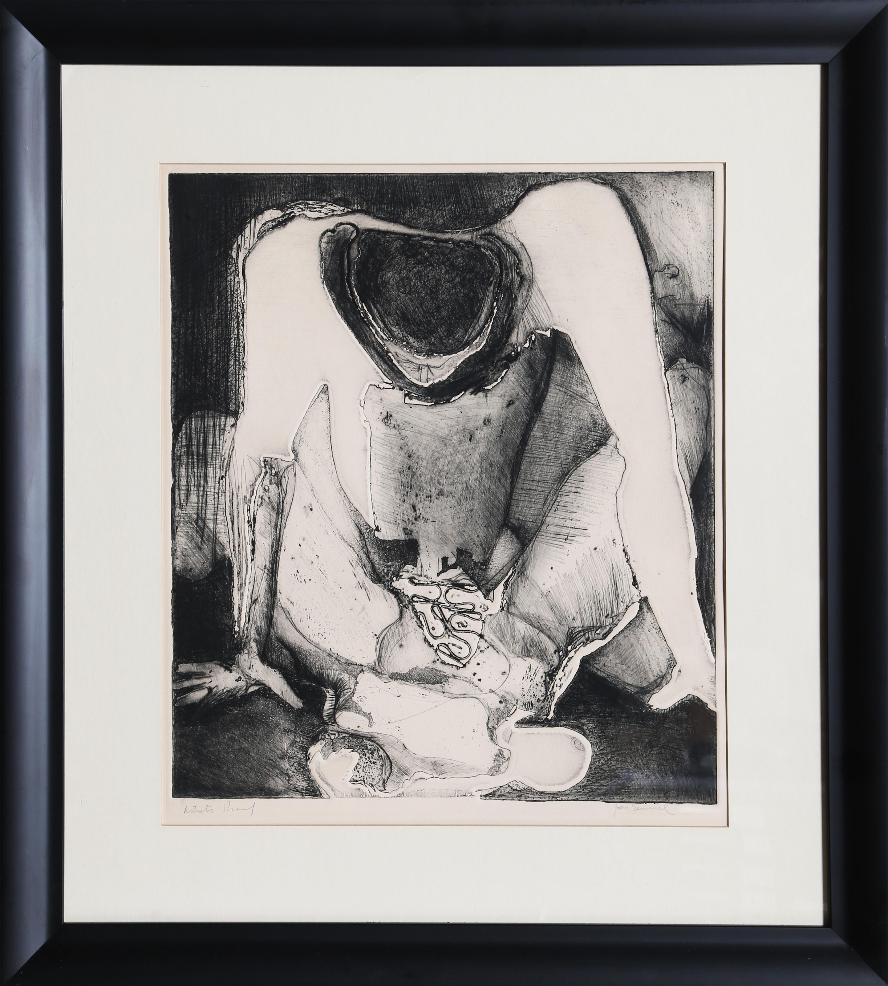 Joan Semmel's "Figure" is an intaglio etching that exemplifies the artist's commitment to depicting the female body with unflinching directness and formal complexity. Through the precise linear language of etching, Semmel constructs volumetric forms that challenge conventional representations of the female nude by presenting bodies from unconventional viewpoints and with assertive physicality. The work reflects Semmel's broader artistic project of reclaiming the female figure as a subject of artistic authority rather than passive objectification.