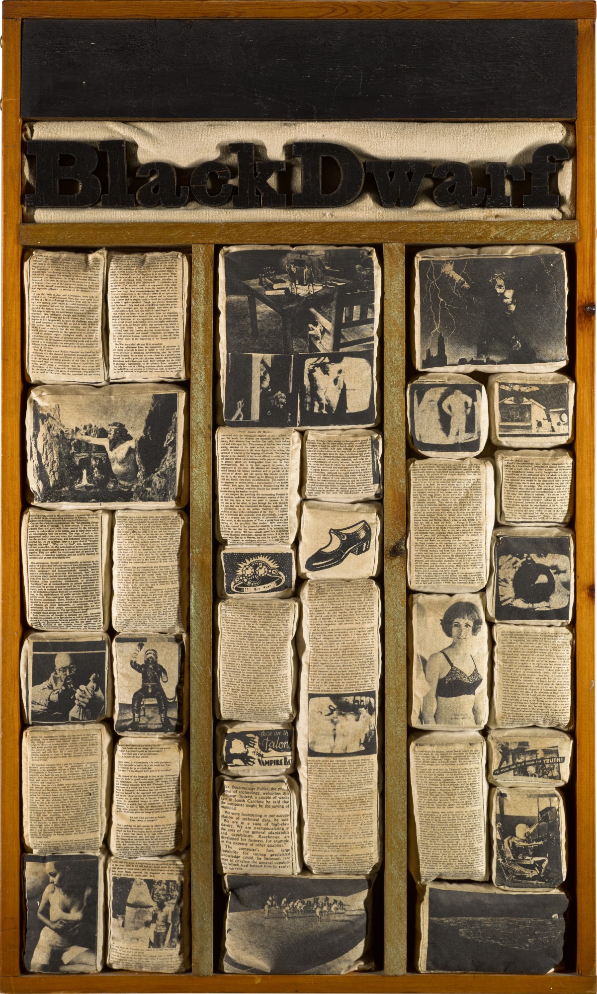 Joe Tilson's Page 4: Snow White & The Black Dwarf from 1969 is a mixed-media construction combining oil and silkscreen print on fabric with stained wood elements. The work illustrates Tilson's innovative approach to narrative themes and material experimentation.