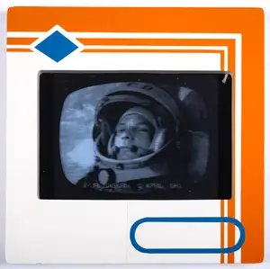 Joe Tilson's "Transparency I: Yuri Gagarin 12 April 1961" is a screenprint on perspex created in 1968 that commemorates the Soviet cosmonaut's historic first human spaceflight. The work was published by Marlborough Fine Art in a limited edition of 20 and presented in its original painted wooden frame, exemplifying Tilson's interest in combining Pop Art sensibilities with technological and historical themes. The use of transparent perspex as a support material reflects both the period's fascination with space exploration and modernist investigations into materiality and optical effects.