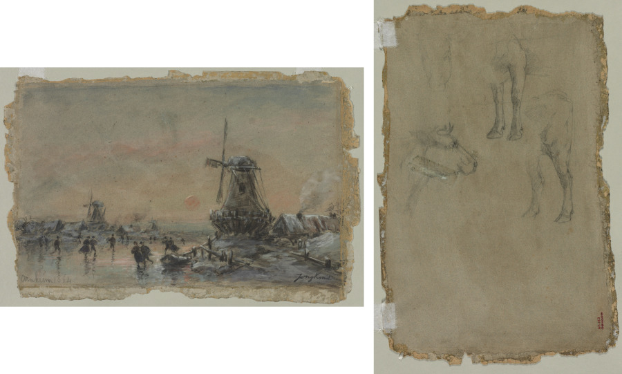 Featuring both a finished townscape and spontaneous animal studies, this double-sided work reveals Jongkind's versatility and his practice of using every available surface for artistic exploration.